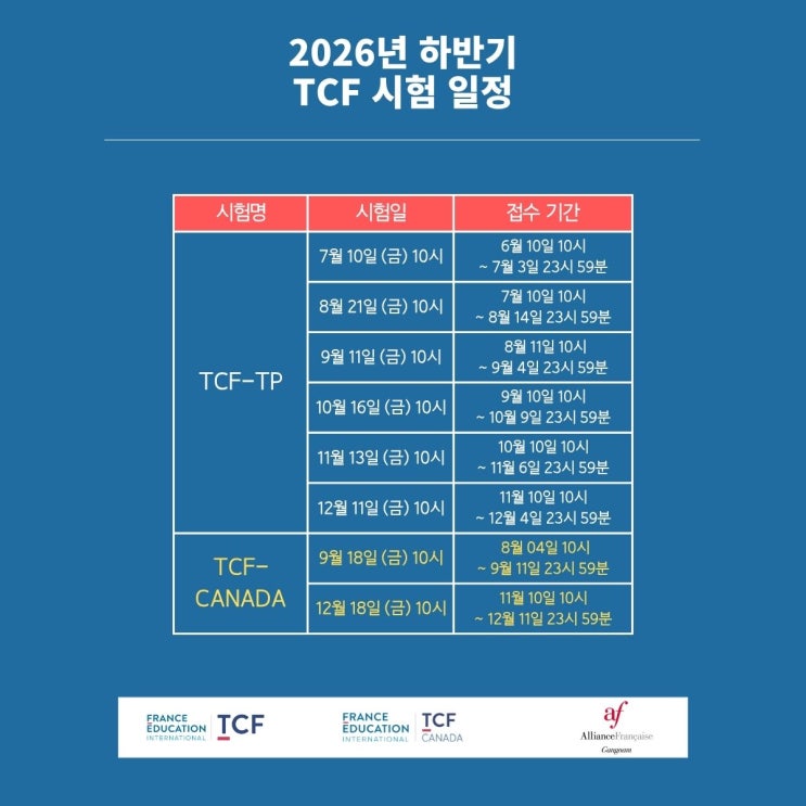 2026년 하반기 TCF 시험 일정 총정리 (강남 알리앙스 프랑세즈) “TCF 시험 언제 봐야 하나요?” “접수는 언제 열리나요?” 매번 문의가 많은 만큼, 2026년 하반기 TCF 시험 일정과 접수 방법을 한 번에 정리해드립니다 ✔️ TCF 시험은 어떻게 진행되나요? 강남 알리앙스 프랑세즈에서는 다음 두 가지 시험을 운영하고 있습니다. ✔ TCF-TP (일반 TCF) → 유학, 어학 수준 증명 ✔ TCF-CANADA → 캐나다 이민 및 비자용 2026년 하반기 시험 일정 모든 시험은 오전 10시에 시작됩니다 ▶ TCF-TP (매월 진행) 7월 10일 (금) 8월 21일 (금) 9월 11일 (금) 10월 16일 (금) 11월 13일 (금) 12월 11일 (금) ▶ TCF-CANADA 9월....... <img src="https://blogthumb.pstatic.net/MjAyNjA0MTNfMTM5/MDAxNzc2MDU2Njc0NTM2.JZ3zuZN7eqQaTqn0IcRpPjZDYHqMrgUzA5ZcxKc9D6Qg.KyAkQEsH1Ayn-fGSRIdjzV-BCXcJAq9jgk4dqkx8X3Qg.JPEG/%28%B0%D4%BD%C3%BF%EB%29TCF_%BE%C8%B3%BB%B9%AE_%281200_x_1200_px%29.jpg?type=s3" />