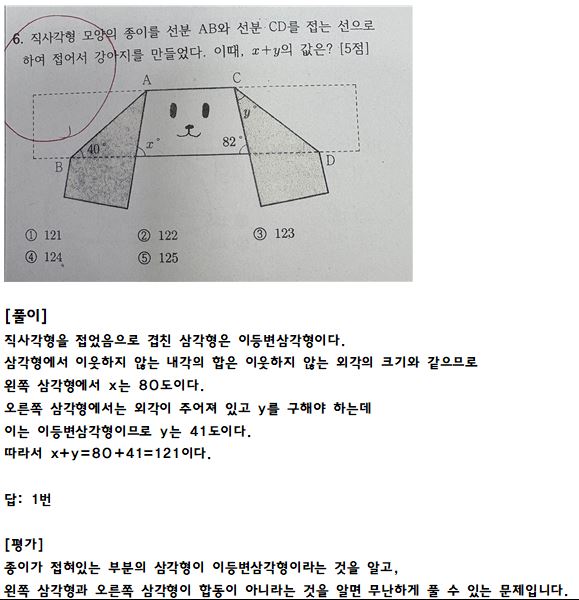 [향남중1 수학시험 총평] * 출제 경향 및 난이도 1학년 첫 시험인 만큼 학생들의 긴장도를 낮추기 위해서인지 문제는 전체적으로 평이하게 나왔습니다. 서술형 또한 2학년에 이어서 1학년도 3문제가 출제 되었고 문제의 난이도는 교과서 난이도였습니다. 굳이 까다로운 문제를 출제하진 않았지만 기본적으로 다각형과 입체도형에서 외워야 하는 공식들이 많기 때문에 평소에 문제를 많이 풀어보지 않았다면 100점까지는 힘들었을 것으로 보입니다. 그리고 서술형 배점이 세분화 되어 출제되어 합동조건 등을 완벽히 학습하지 못한 학생들은 감점을 받을 수 도 있었습니다. [향남중1 수학 핵심 문항 풀이 - 선택형 23번] [향남중1 수학 핵심 문항....... <img src="https://blogthumb.pstatic.net/MjAyNTEyMTJfMjYz/MDAxNzY1NTM4ODY4NTAy.3ym6eVgUcNpPks3GCPCs627SmSnvjQQw3EIjNlwUiWAg.jRZP4VddH_-UN6ZYIUcZpOI7k_AMksqvt16pVGJ4ZuYg.JPEG/%C7%E2%B3%B2%C1%DF1_6%B9%F8.JPG?type=s3" />