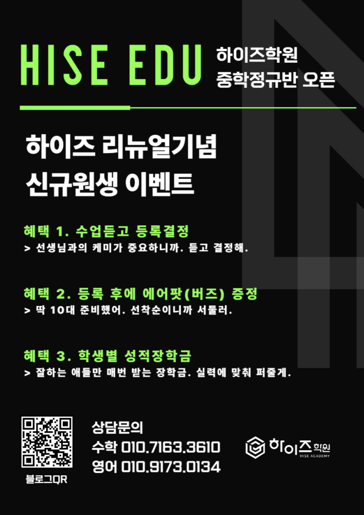 하이즈학원 중학정규반 오픈 및 특별이벤트