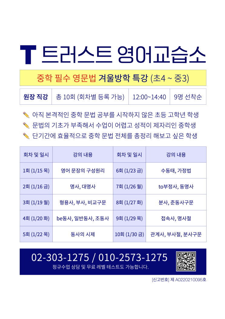 트러스트에서 중학 영문법 겨울방학 특강 안내드립니다.