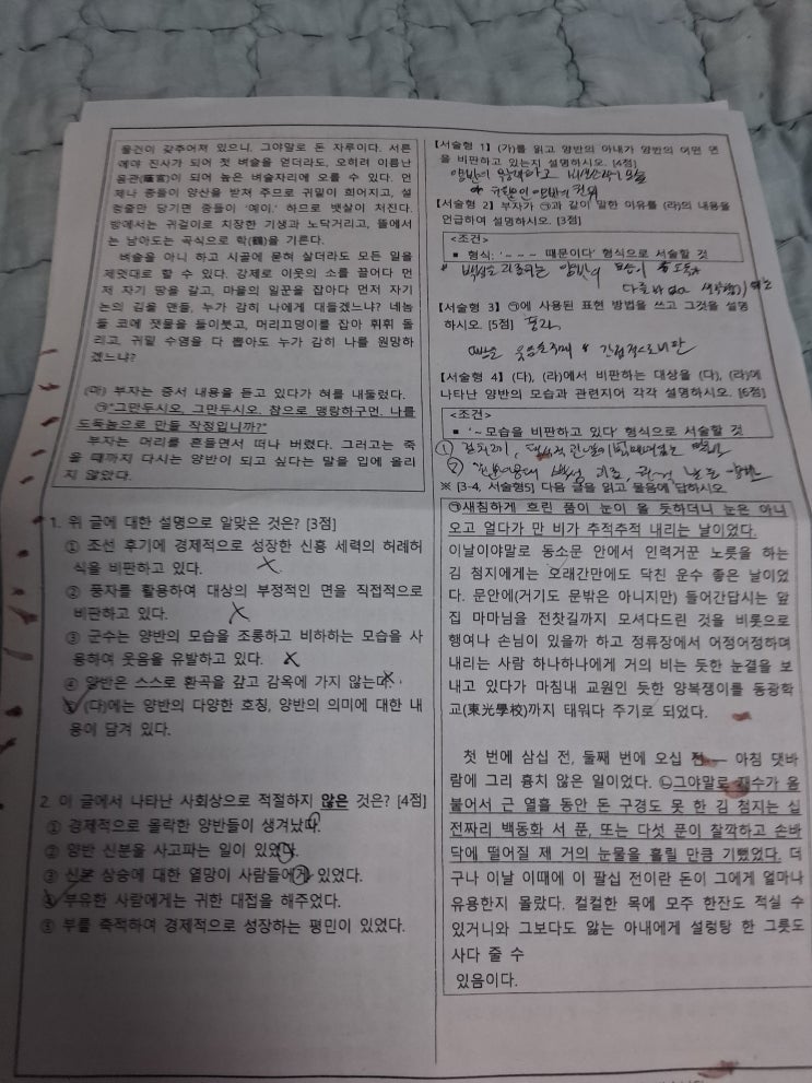 2025-2학기 기말고사 남중 2학년 총7면 서술형14문항. 객관식8문항 [객관식1] 3점 범위: 양반전 유형: 제시문(가)~(마)를 주고 전반적인 내용 일치를 묻는 문항이 출제됨. 특히 선지 2번에 '풍자'의 개념과 관련 직접 비판이 아닌 간접 비판이라는 것을 알고 있느냐가 관건임 . 평이한 문항 [객관식2]4점 범위: 양반전 유형: 양반전에 나타난 '사회상'을 물어보는 문제가 출제됨 평이한 문항 [서술형1] 4점 범위: 양반전 유형: '양반의 아내'가 양반의 어떤 면을 비판하고 있는 지 설명하는 문제가 출제됨. 평이한 문항 [서술형2] 3점 범위: 양반전 유형: 부자가 두번째 증서를 보고 ' 자신을 도둑놈으로 만....... <img src="https://blogthumb.pstatic.net/MjAyNTEyMTFfMTMz/MDAxNzY1NDMwMDg0NDg4.pRstAAqJTg3CkYlamfmq0AVzoVyQ1WlBlNd7mfe6bS4g.nY1cmxEhv0T_Qe-wXK3BD1xEdiX8gCjGlYQwf9g5VyYg.JPEG/2.jpg?type=s3" />