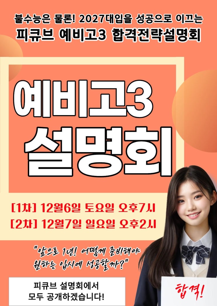 2027입시! 한번에 성공하는 '예비고3 설명회!' 피큐브 학원