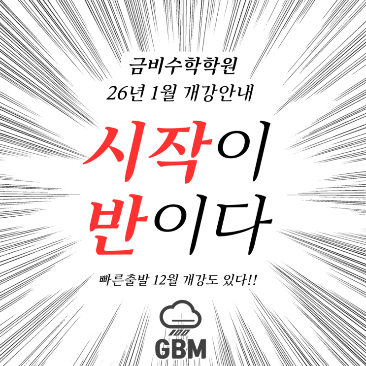 [금비수학] 25년 12월~26년 1월 정규반 개강반 안내 금비수학의 겨울 시즌 정규 수업이 아래와 같이 개강합니다. 학년별·수준별로 구성된 커리큘럼으로 새 학년 대비 완벽한 기초·심화 학습을 진행합니다. 12월 개강 반 안내 ✔ 중등3-1 기본+심화 : 예비중2 개강: 25년 12월 12일(수) 요일 및 시간 교과: 매주 수·금 pm 7:00~10:00 RTO: 매주 월 pm 7:00~10:00 교재: 중등3-1 쎈, 에이급수학 ✔ 공통수학2 기본 김수현 원장 + 한규동 부원장 직강반 개강: 12월 12일(금) 요일 및 시간 교과: 매주 수 pm 5:00~9:00 교과+RTO: 매주 금 pm 5:00~10:00 교재: 기본정석, 쎈 ✔ 대수 심화 + 공수2 심화 김수현 원장 직강반 개강: ....... <img src="https://blogthumb.pstatic.net/MjAyNTEyMDRfMjIw/MDAxNzY0ODI1OTMwNzgy.Yn6sF3ko-fXyy9KyRVl1JStlgLOW0Q210jrWQb645qQg.idU4Q0OeMzn3jT4HZUyBu96mmrHdBmF6-XUnG14-AIIg.PNG/26%B3%E21%BF%F9%B0%B3%B0%AD.png?type=s3" />