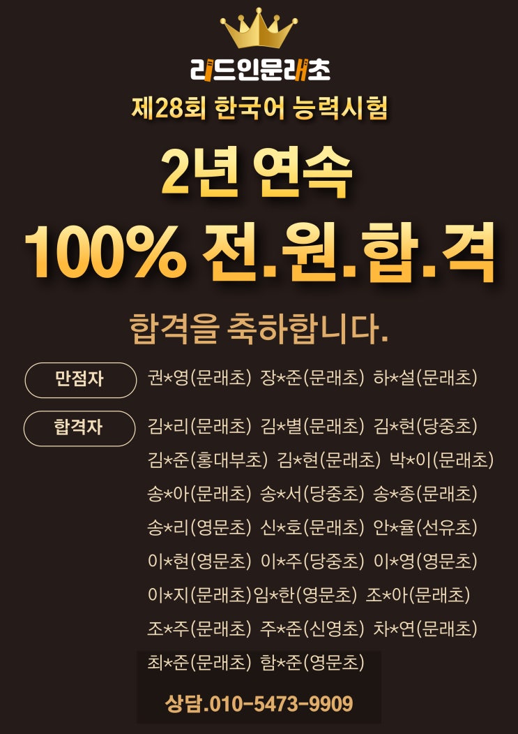 안녕하세요. 리드인 문래초점입니다.:) 지난 11월 1일(토) 연세대학교 공학원에 치러진 제28회 한국어 능력시험에서 리드인 문래초점이 만점자 3명을 배출하며, 2년 연속 전.원.합.격.의 영광을 이뤄냈습니다! 무엇보다 성실하게 시험을 준비하고, 떨리는 심장을 부여잡으며 끝까지 최선을 다한 우리 아이들에게 깊은 감사와 축하의 마음을 전합니다. "얘들아~ 정말 너희들이 자랑스럽다." #리드인문래 #문래리드인 #리드인문래동 #문래동리드인 #리드인영등포 #리드인영문초 #리드인문래초 #문래초리드인 #영문초리드인 #영등포리드인 #문래독서논술 #독서논술리드인 #영등포독서논술 #리드인목동 #목동리드인 #리드인오목교 #오목교....... <img src="https://blogthumb.pstatic.net/MjAyNTEyMTJfMjYg/MDAxNzY1NTE0NTgzODI4.UriAQzvlFAV8vHBKI_doV0QAjKdl43PwviujfxjUA_sg.l56yzaEHSCqviX0iVh88ntaXvHJJV5fXZxRv3EJ0_Bwg.JPEG/A4_%C7%D1%B1%B9%BE%EE-001.jpg?type=s3" />