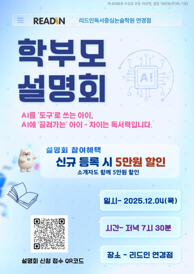 안녕하세요 리드인 연경점입니다. 아이들의 교육을 위해, 더 나은 방향을 찾고자 늘 애쓰시는 우리 학부모님들께 함께 고민하는 시간과, 좀 더 나은 방향을 제시하고자 학부모 설명회를 준비했습니다. AI 도입으로 아이들의 학습 환경이 빠르게 변하고 있는 지금, 아이들에게 필요한 것은 무엇일까? 지금 어떤 준비를 해야 할까?에 대한 이야기를 함께 나눌까 합니다. 리드인이 찾은 해답으로 현재 우리 리드인 친구들이 꾸준히 하고 있는 방향과 앞으로의 연결고리를 원장이 직접 설명드리겠습니다. ✨️ 학부모 설명회 안내 ♦️ 일시 : 2025 년 12월 4일 (목) ♦️ 시간 : 저녁 7시 30분 ♦️ 장소 : 리드인 연경점 ♦️ 대상 : 초. 중등 학부....... <img src="https://blogthumb.pstatic.net/MjAyNTExMTVfMTgy/MDAxNzYzMTg0NTIzNzc2.NNhgEkMQQw6o3woTQJSSHtpm6BZPhCn2s-NlpcYW1SIg._sE-Gz5TspdIxwUfmNrQWknWtPtNuL3PJtNDsOd9iO4g.JPEG/900%A3%DF1763110322000.jpg?type=s3" />
