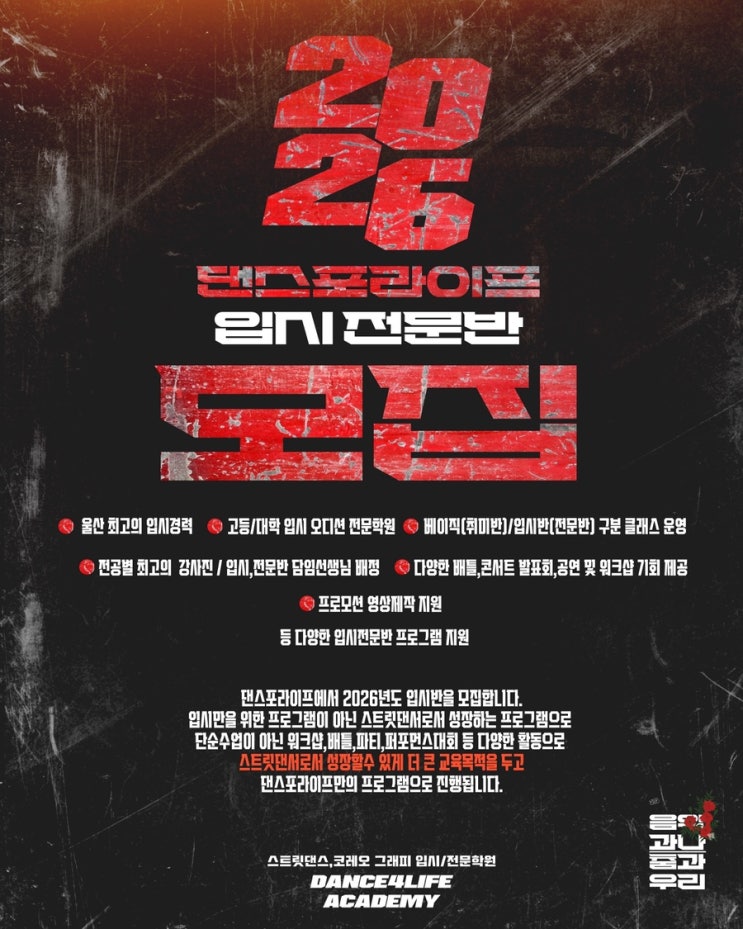 . 〽️ 입시전문반 모집 [ 입시_전문 / 취미_베이직 / 개인레슨 ] . 울산 스트릿댄스 입시/전문학원 - 댄스포라이프 입시_전문반/취미_베이직반/개인레슨 . 울산광역시 강남교육지원청 지정 학교교과교습학원(댄스) 댄스 교육학원 등록 제 5684호 주소 - 울산광역시 남구 신정1동 518-33 3층 . ✔️수시모집....... <img src="https://blogthumb.pstatic.net/MjAyNTEyMDFfMjEx/MDAxNzY0NTg3NTgxMTg4.KODG39XLNPMMH-xOctRDI3-hPEuGCmZaogsVcAoBgcEg.OUv1pxKEpyqiB-_2SabhseJtIreuJuXhNO-NaTDDkqUg.JPEG/IMG%A3%DF4963.JPG?type=s3" />