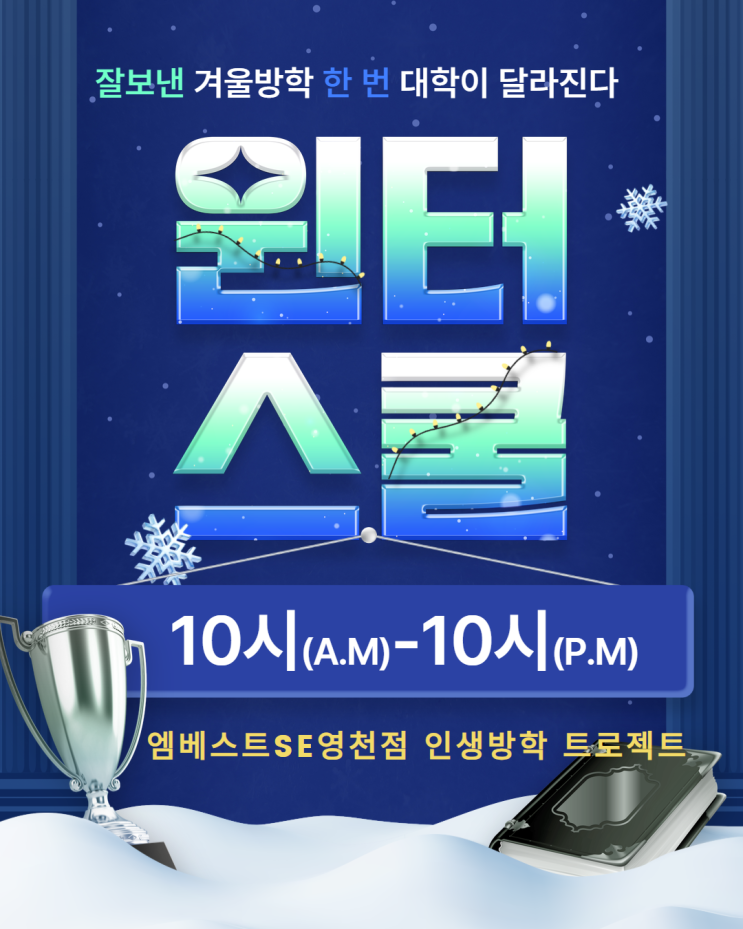 학창시절 가장 중요한 기간 겨울방학이라는 사실 알고 계신가요? SKY합격자들도 겨울방학에 가장 많은 표를 주었음을 볼 수 있습니다. 하지만, 겨울방학을 알차게 보내려니 무엇을 어떻게 해야할지도 막막하고 계획은 어찌어찌 세웠지만 실천을 해나가는 것 또한 쉽지 않을텐데요 최고의 겨울방학을 보내기 위한 #엠베스트se영천점 의 인생방학 프로젝트 바로 #10to10 #윈터스쿨 입니다 #영천윈터스쿨 하루 12시간의 시간을 선생님들의 관리 하에 무엇을 어떻게 계획하고 공부해야 할지 꼼곰하게 관리를 받으며 시행착오 없는 알찬 방학을 보낼 수 있게 준비하였습니다. 무언가를 잘하기 위해서는 잘하고 있는 사람이나 조직을 벤치마킹하는 것이....... <img src="https://blogthumb.pstatic.net/MjAyNTEyMDFfMjgz/MDAxNzY0NTkxMzU1OTY0.1OBe-NqMqYFv2VIrPH208VitAH-GEVk7ZkjSM4XflRog.iz55VSRXHMEm3JYKxk1Xp0UkA78bwEdFptk7YU71c9Qg.PNG/%C1%A6%B8%F1%C0%BB_%C0%D4%B7%C2%C7%CF%BC%BC%BF%E4_-_2025-11-30T205946.389.png?type=s3" />