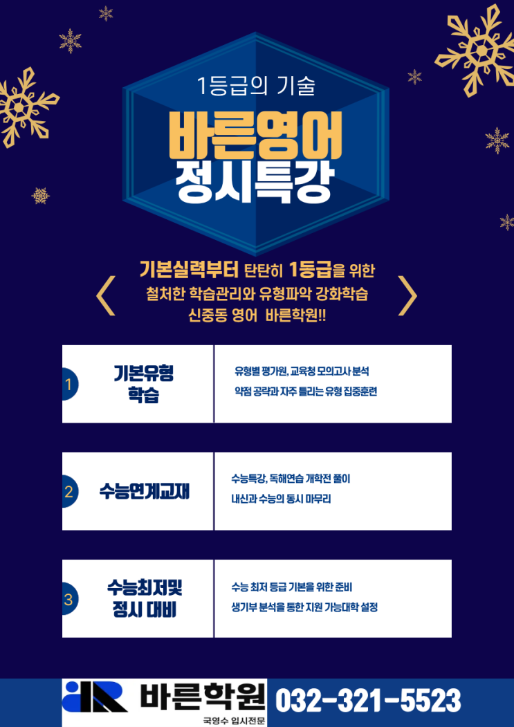 신중동 바른학원 영어 정시반 개강 안내입니다. 수능 영어의 필요성 올해 불수능으로 영어 과목의 중요성이 커졌습니다. 비록 절대 평가 과목이기는 하지만 수시의 최저등급을 맞추는데 있어서 절대적으로 필요한 영역입니다. 아울러 영어 등급에 따른 정시의 대학 라인이 결정되기도 합니다. 바른 학원 영어의 강점 오랜기간 수능 영어를 지도하신 원장선생님 직강으로 선택된 소수의 학생을 위한 수업입니다. 우선 수업하기전 생기부 상담을 컨설팅을 통한 대학 라인의 설정으로 영어 과목에 대한 수업방향성과 지도 방향이 결정 됩니다. 바른 학원 영어 구성 및 시간 12월 부터 1월 까지는 평가원 기출 및 수능 기출을 통한 유형파악과 약점을....... <img src="https://blogthumb.pstatic.net/MjAyNTEyMDlfMjY2/MDAxNzY1MjU5MzQ4ODY1.8hPNnR2Hv2u9_uSfwzD9oRMlDU5XsT3pezIsDdI489og.W5YYE-2eJO1nYj8-9K5TbaZEOiE0DFSC8St_yvFqA1Ig.PNG/%C1%A4%BD%C3%BF%B5%BE%EE.png?type=s3" />