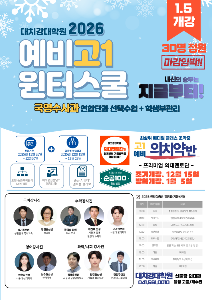 안녕하세요. 천안 불당동 입시의 중심, 대치강대학원 입니다. 얼마전 어느 멋진날 찬 바람과 함께 첫눈을 맞이 했는데요. 12월 입시 계절 입니다. 학원 밥만 30년을 먹으며 수많은 학생을 지켜본 결과, 변하지 않는 진리 하나가 있습니다. "고등학교 3년의 성적표는 , 중3 겨울방학에 쓰여진다." 고등 입학 전, 이 '골든타임'에 무엇을, 어떻게 보내느냐가 의대, 명문대의 당락을 가릅니다. 학부모님들의 그 간절한 마음을 알기에, 올 해 대치강대학원은 더욱 강력해진 라인업과 시스템으로 2026 윈터스쿨을 준비했습니다. 1. "내신의 승부는 지금부터" 2026 예비고1 윈터스쿨 많은 학부모님이 윈터스쿨을 고민하....... <img src="https://blogthumb.pstatic.net/MjAyNTEyMTBfMjY4/MDAxNzY1MzYyODc4OTE5.BjyJkQdU9SRlxal4P8ui3rUcXt3N2oje7CLVONXZ7bcg.Y1lPowg6KkXy_0Wv1ihRiJSys1fT7FjuZRf-vZRfd2sg.PNG/2026%B4%EB%C4%A1%B0%AD%B4%EB_%C0%A9%C5%CD-001.png?type=s3" />