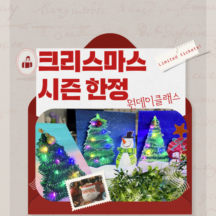 크리스마스를 특별하게 만들어줄 보정동 취미미술 필아트에서 원데이클래스를 소개합니다. 수채화로 그린 크리스마스 트리에 실제 전구를 달아 불을 켜는 감성 가득한 작품을 만들어보세요. 어떤 클래스인가요? 크리스마스 트리와 오브제를 수채화로 드로잉한 뒤, 전구를 달아 실제로 불이 켜지는 특별한 작품을 만드는 보정동 원데이클래스입니다. 크리스마스 이브 저녁, 불을 켜면 따뜻하고 감성적인 분위기를 연출할 수 있는 나만의 인테리어 소품이 완성됩니다. 누구나 쉽게 접할 수 있는 수채화 기법과 전구 장식까지 한 번에 배울 수 있는 특별한 시간입니다. 이런 분들께 추천해요 ✨그림을 처음 접하시는 분도 부담 없이 참여 가능해요 ✨....... <img src="https://blogthumb.pstatic.net/MjAyNTEyMTFfNzkg/MDAxNzY1NDM4MjAwMjI5.0gSWKJFD9jYP8XpfNloHpAlvWmTtT3p3XTI8D51Y_Acg.292Ojd7Ik_S4bXMKBiMn5oeUdlRgGdPGgVCF3Yt4O4Ug.PNG/%C5%A9%B8%AE%BD%BA%B8%B6%BD%BA-%BD%C3%C1%F0%C7%D1%C1%A4-%C5%AC%B7%A1%BD%BA.png?type=s3" />