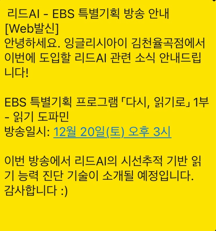안녕하세요. 1월 확장을 앞둔 율곡동 잉글리시아이에서는 독서 문해력 프로그램을 도입하였습니다. 시간 추적 기반의 문해력 솔루션을 제공하는 리드AI입니다. 확장 이전을 앞두고 있는 율곡동 잉글리시아이에서는 아이들이 기본 문해력에서 어려움을 겪으며 영어 성적 향상이 더디어 독서 문해력 프로그램 진행을 결정하였습니다. 저희 독서 문해력 프로그램의 특징은 시선추적기술로 아이가 어떻게 글을 읽는지 정확히 진단 가능합니다. 1월에 학부모님들 대상으로 설명회를 열 예정이고 20명 선착순으로 1달 무료 이벤트를 진행할 예정입니다~ 많은 참여 부탁드립니다. 아울러 이번에 도입할 리드AI의 시선추적기반 읽기 능력 진단 기술이 방....... <img src="https://blogthumb.pstatic.net/MjAyNTEyMTBfMjgw/MDAxNzY1Mzc1MTI0OTU0.laRuxm6jDytkZQsTgvrF-tRs_W-4qI8elV1nLwicxdgg.JBA5s1ajUlEgg-2ZU9BhNFItKFC5SXJXVZNlUhsdQRwg.JPEG/IMG%A3%DF3643.jpg?type=s3" />