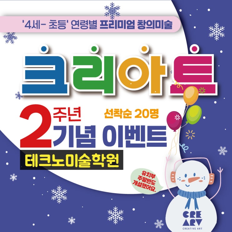크리아트 테크노미술학원이 벌써 2주년을 맞이하게 되었네요. 쌀쌀한 날씨, 아이들의 움츠린 겨울 방학에 크리아트 테크노미술학원이 활력을 불어 넣어 봅니다. 경기도 침체한 요즘 학부모님들의 줄어든 경제활동에 조금이나마 도움이 되고자, 작지만 힘내시라고 여러 이벤트를 준비 해 봤습니다. 크리아트 대구지사 (테크노미술학원) 2주년 이벤트 첫번째- 등록시에만 한번 내시는 입회비 3만원을 면제 해 드립니다. 두번째- 등록시, 주말 이벤트 수업 1회 무료. 주말에 운영하는 '심주크 데이즈' - 심심한 주말 크리아트와 함께하는 날 이란 뜻으로 다양한 미술 수업을 진행하여 아이들의 주말 수업을 책임 집니다. --공지-- 주말 창....... <img src="https://blogthumb.pstatic.net/MjAyNTEyMDRfMjU1/MDAxNzY0ODI5NzUwNTk2.szQGRRHp9KIyvvn_KOFdv3J_pZyO82DJpZiS9qPeBlYg.VHgXCijgdPETw4my9uGyhRw1eqdyGyDpAq3IkvRvIRsg.JPEG/%B8%AE%C6%B2%B8%AE-%C1%A4%BB%E7%B0%A2-2%C1%D6%B3%E2-%B9%E8%B3%CA.jpg?type=s3" />