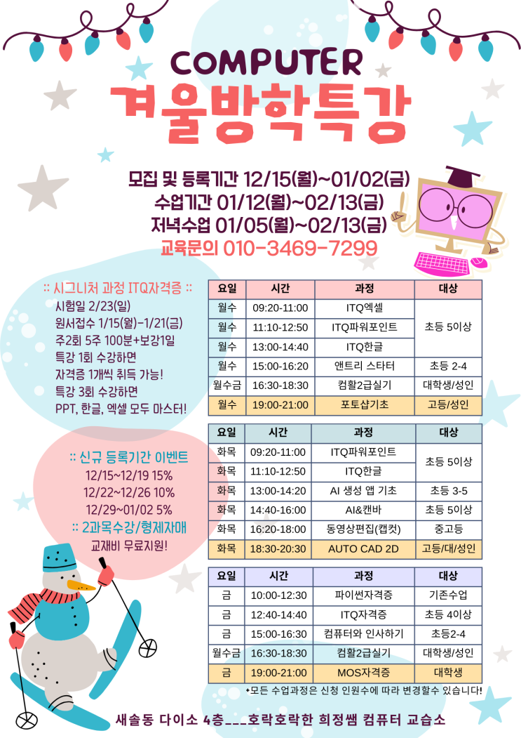 안녕하세요? 호락호락한 희정쌤 컴퓨터 교습소입니다^^ 2025년 겨울방학특강을 아래와 같이 진행하며 이번 게시물에는 각과정을 간단히 소개하는 이미지도 함께 올리니 참고하시길 바랍니다^^ 방학특강과정은 학기중 바쁜 학생들을 위한 과정입니다~ 6주만에 취득하는 ITQ자격증과정과 초등 저학년이 참여할수 있는 재미있고 알찬 내용의 과정까지 개강 예정이니 많은 관심 부탁드립니다~ 특히 이번 모집은 등록기간할인 이벤트를 진행으로 착한 교육비로 참여할 수 있는 좋은 기회이니 적극적인 참여 바랍니다! ** 초등학생 고학년-성인 대상 과정 ** ** 중고등학생-대학생-성인 대상 ** ** 중고등학생-대학생-성인 대상 ** 건강 유의허시고 감....... <img src="https://blogthumb.pstatic.net/MjAyNTEyMDhfMjkx/MDAxNzY1MTk3NzMzODM3.gt7oTnUIcoCIXG5aXjYeSjZ2WRSbn9guq7beMvAlxHMg.cUgAZYxKkHUFQlSAeTgSGpe8Mvxkfbpxt2lhevkWdiog.PNG/2025_%B9%E6%C7%D0%C6%AF%B0%AD_%283%29.png?type=s3" />