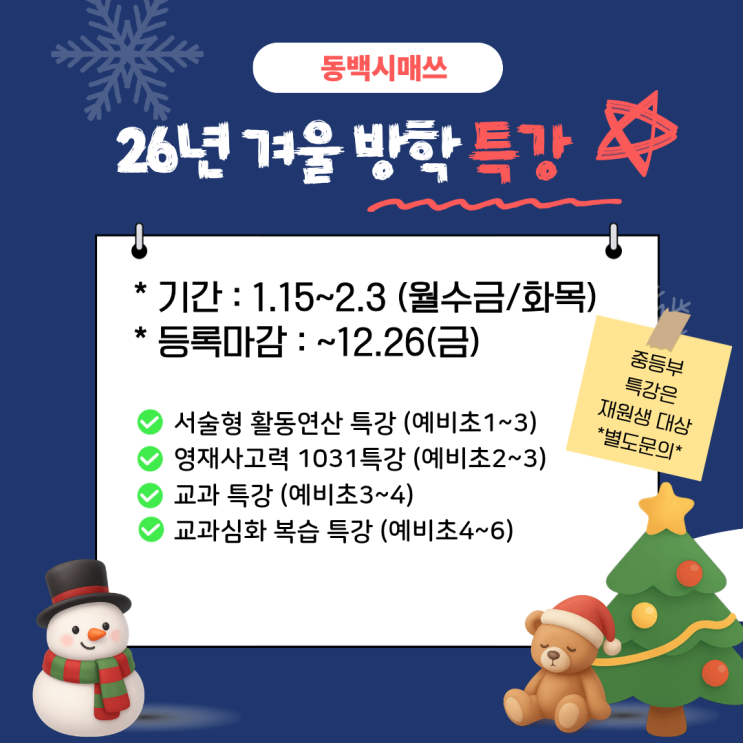 동백시매쓰 26년 겨울방학특강 방학특강으로 학기중 부족했던 부분, 어려운 영역들을 보완하고 새학년을 자신있게 대비해보세요! 초등부 겨울방학 특강 26.1.15~2.3 (*중등부는 별도 문의) ✅특강 기간✅ 26.1.15~2.3 월수금 1.19~1.30 화목 1.15~2.3 ✅특강 시간✅ 10시30~12:20 * 등록마감 : 12.26(금) 선착순 등록마감 ✅특강 대상✅ ✔초등부 : 예비초1~6 (재원,비재원) ✔중등부 : 재원생만 가능 (별도 학원 문의) ✅특강 프로그램✅ 초등부 저학년 특강 서술형 활동연산 (예비초1~3) 영재사고력 1031 (예비초2~3) 교과 (예비초3) 고학년 특강 교과 (예비초4) 교과심화복습 (예비초4~6) 특강....... <img src="https://blogthumb.pstatic.net/MjAyNTEyMDVfODgg/MDAxNzY0OTIzODE1MjQx.Q-N1YjZsq5HI0kQVKUIMtzsZ45xUyXhoY9wBhJk2ZQIg.YppmIKttFlTI2LnHQGdxwS73g-rACRLffMyK4_q6mMQg.PNG/%C1%A6%B8%F1%C0%BB_%C0%D4%B7%C2%C7%D8%C1%D6%BC%BC%BF%E4._%2825%29.png?type=s3" />