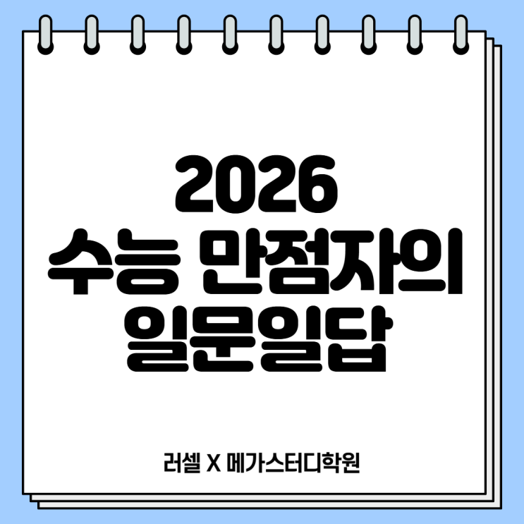 안녕하세요 러셀X메가스터디학원입니다. 오늘은 2026 수능 만점자의 각 과목 별 공부법부터 자신 없던 과목 성정 향상법까지! 일문일답으로 공부 비결을 한 번 알아볼까요? Q1. 자기소개 부탁드립니다! 안녕하세요, 러셀 전주에서 공부해 2026학년도 수능 만점을 받은 이하진입니다. 저는 고등학교 3학년 겨울방학부터 수능 직전까지 신성규 선생님의 정규반 단과 수업을 수강했습니다. Q2. 6평, 9평 성적 변화가 어떻게 되세요? (국수영탐탐 순) 전 국어는 언매, 수학은 미적분, 탐구는 물리학 II, 지구과학 II를 선택하였고 6평에서는 11121, 9평에서는 11111을 받았습니다. Q3. 각 과목별로 공부할 때 효과적이었던 학습 방법이 있으신가요? 국....... <img src="https://blogthumb.pstatic.net/MjAyNTEyMDlfMTgx/MDAxNzY1MjQyNDAyNDMw.xeXoB6xPxzjVBdEl29bJn165IrB42l7q5pyX8l3k4Iwg.4u5O9wN5vvee9mvBPIFvMwfl0bINonQQ8Y9DX9watWwg.PNG/%C1%A4%BA%B8%BC%BA_%BA%ED%B7%CE%B1%D7_%BD%E6%B3%D7%C0%CF_%285%29.png?type=s3" />