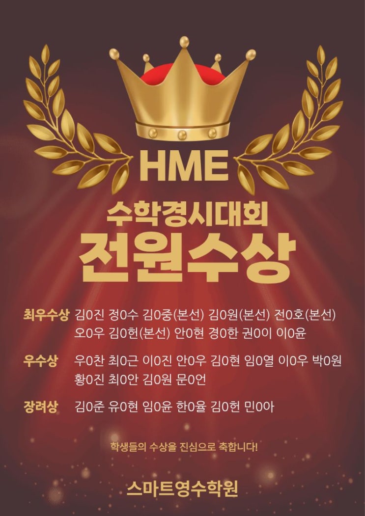 안녕하세요! 스마트 영수학원입니다 지난 11월, 2025년 HME 수학 경시대회에 우리 학원에서는 지난번 보다 더 많은, 총 29명의 학생이 도전했습니다! 그리고 모두가 열심히 노력해준 덕분에 아주 자랑스러운 결과를 받아들 수 있었습니다! 최우수상 – 11명 우수상 – 12명 장려상 – 6명 특히 눈부신 점은 본선 진출자 4명 배출! 본선은 전국 상위 5%의 학생만이 진출할 수 있는 자리인데요, 그 어려운 문을 당당히 통과한 친구들이 있어 더욱 뜻깊습니다! 우리 아이들의 빛나는 노력과 성과에 박수를 보냅니다! 이번 HME 대회는 단순한 수학 실력의 겨룸을 넘어, 우리 아이들이 스스로를 넘어서는 값진 도전의 장이었....... <img src="https://blogthumb.pstatic.net/MjAyNTEyMDlfMTE3/MDAxNzY1MjgwMzIxMTQw.OKa63toVrwCqnQZIchv9wAAOKFkkkSbAoNETOCKnnDkg.2hRmwd2uFkAE1GelID2d2ixx1ZicFLu7usETFE1Bdpcg.JPEG/%C1%A6%B8%F1%C0%BB_%C0%D4%B7%C2%C7%D8%C1%D6%BC%BC%BF%E4..jpg?type=s3" />