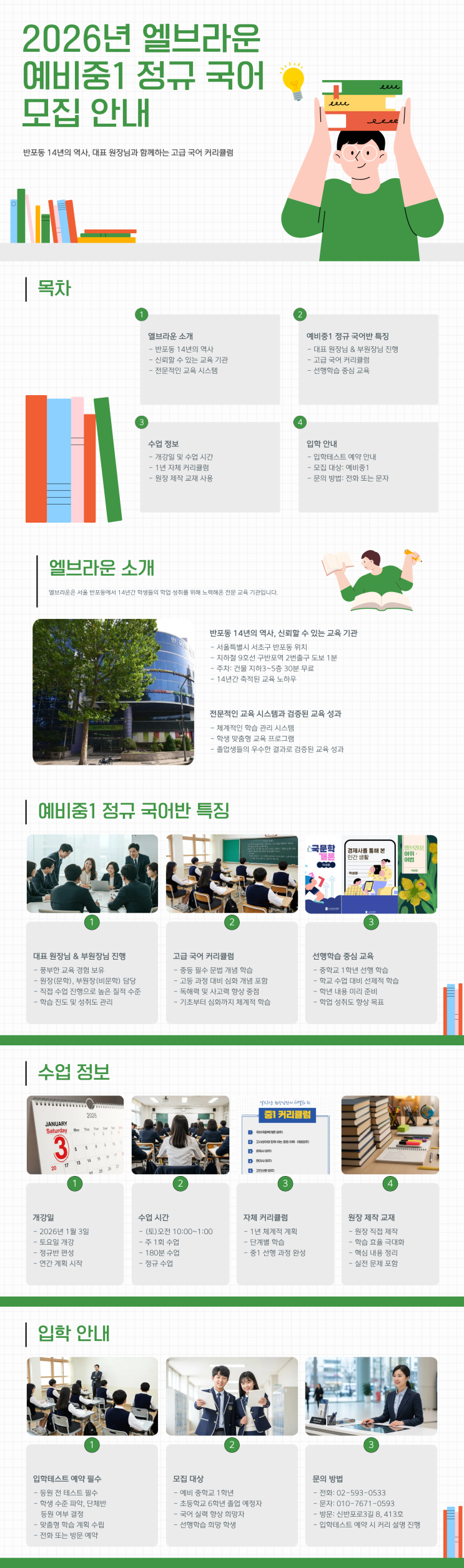 ✨ 2026년 중1 국어 선행반 모집 ✨ 안녕하세요, 엘브라운 국어입니다. 원장 직강 · 3년 완성 국어 선행 커리큘럼 모집 주 1회 · 3시간 집중 수업 문학(원장님) + 비문학(부원장님) 동시 진행 중등 내신까지 이어지는 체계적 선행 시스템 개강 2026년 1월 3일(토) 오전 10:00~13:00 반포동 14년 역사! 엘브라운의 시작점에서 만나는 진짜 국어 탄탄한 전통과 검증된 커리큘럼으로 학생 개개인의 국어 실력을 깊이 있게 성장시키는 프로그램입니다. ✏️ 문학·문법·사회·역사까지! 중1 필수 기반 학습을 전 영역으로 확장하여 “국어 한 과목으로 모든 교과의 기초를 잡는 수업”을 제공합니다. 놓치면 후회할 선행의 골든타임! ?....... <img src="https://blogthumb.pstatic.net/MjAyNTEyMDNfMTkg/MDAxNzY0NzU1MzE4MjYx.G2DDXK0DvAEFipxUIc57X0N335TxEmBi4wJhY2836HMg.s8Q9ytK-oPGLC4V6m_IRpDsbvmANuz63zZ0sm4ncX28g.PNG/2026%B3%E2_%BF%A4%BA%EA%B6%F3%BF%EE_%BF%B9%BA%F1%C1%DF1_%C1%A4%B1%D4_%B1%B9%BE%EE%B9%DD_%B8%F0%C1%FD_%BE%C8%B3%BB%28%B9%DD%C6%F7%29_%281%29.png?type=s3" />