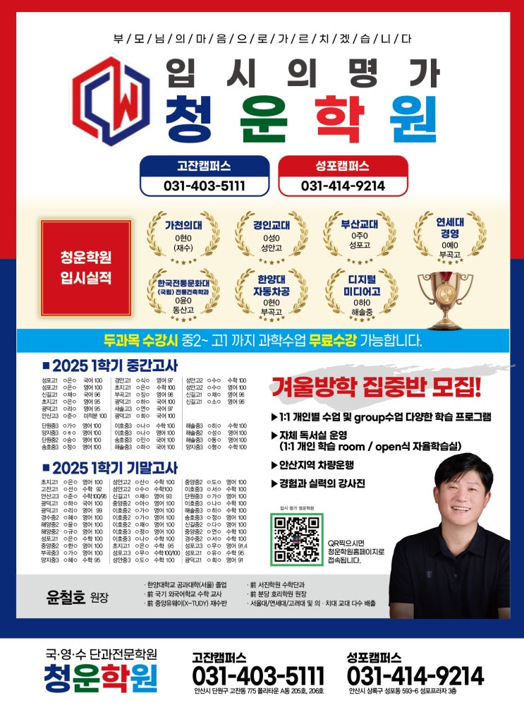 고잔동수학영어학원 입시명가 청운학원고잔동캠퍼스 2025년 겨울방학집중반을 모집합니다. 수학 영어 2과목 수강시 중2부터 고1까지 과학 수업을 무료로 수강할 수 있습니다. 중3 예비고1 수업은 방학동안 수학영어 4시간 수업으로 진행합니다. 부모님의 마음으로 가르치고자 노력하겠습니다. 카메라를 찍으시면 청운학원 고잔동캠퍼스로 바로 갈 수 있습니다. 비범함은 무수히 많은 평범함이 쌓인 결과물이다. - 정약용 - <img src="https://blogthumb.pstatic.net/MjAyNTEyMDRfMTE1/MDAxNzY0ODM2NzQyNzg5.vzAHOdWmP1NigHrpTPY3D8orXJQ6Mklnx5q0dgbIQowg.CsGFkm45-29Gp05To0AKU794d4SevysNITxC6ghgKZMg.JPEG/2025%B3%E2%B0%DC%BF%EF%B9%E6%C7%D0%C0%FC.jpg?type=s3" />