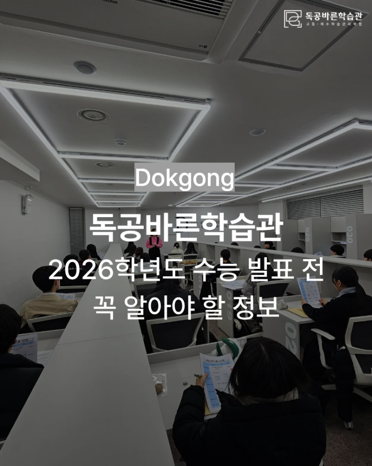 안녕하세요 울산 재수학원, 관리형독서실 독공바른학습관 입니다 :) 올해 수능이 끝나고 이제 성적발표만 기다리고 있는 시기죠. 사실 많은 학생들이 이 기간을 가장 불안한 시간이라고 이야기합니다. 시험은 이미 끝났고, 손에 잡히는 건 없는데 마음은 계속 움직이니까요. 그래서 오늘은 성적표가 공식 발표되기 전까지 꼭 알아두면 좋은 핵심 포인트들을 정리해봤어요. 특히 울산 지역에서 재수학원,독학재수학원, 관리형독서실을 고민하는 학생,학부모님께 도움이 될 내용만 골라 담았습니다. 수능 성적 발표 전에 꼭 알아야 할 정보는 어떤게 있을까요? 1. 성적표 발표 시 확인해야 할 핵심 요소 미리 알아두기 성적표가 나오면 보게 되는 건....... <img src="https://blogthumb.pstatic.net/MjAyNTEyMDRfMTk0/MDAxNzY0ODQxMTQwMDEx.D6SKxcYg79FFkFpc7Hy_Tj8O9mmiFmggwlf8cXGvsgog.wVKSZ_ybf18_3HChb6w0VDApkSWYq8bpfCdUqfLpWDkg.PNG/%C1%A6%B8%F1%C0%BB_%C0%D4%B7%C2%C7%D8%C1%D6%BC%BC%BF%E4._%282%29.png?type=s3" />