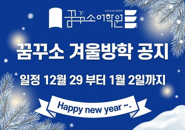 ❄️안녕하세요, 꿈꾸소 어학원입니다. 어느덧 한 해를 마무리하고 새로운 시작을 준비하는 계절이 되었습니다. 올 한 해 동안 꿈꾸소에서 열심히 공부해 준 우리 학생들과, 믿고 맡겨주신 학부모님들께 깊은 감사의 말씀을 드립니다. 우리 학생들이 다가올 새 학기에 더 높이 비상할 수 있도록, 잠시 재충전의 시간을 가지려 합니다. 겨울 방학 일정을 아래와 같이 안내해 드립니다. [겨울 방학 일정] 기간: 12월 29일(월) ~ 1월 2일(금) 정상 수업 재개: 1월 5일(월)부터 정상 수업이 진행됩니다. 가족들과 함께 따뜻하고 행복한 연말연시 보내시길 바라며, 방학 동안 학생들이 에너지를 가득 채워 돌아올 수 있도록 격려 부탁드립니다. 밝....... <img src="https://blogthumb.pstatic.net/MjAyNTEyMTlfMTcz/MDAxNzY2MTI1NzA2MDk1.jj0hGHrDrlyRtsrkfZkEfjPvAKEHPtm6B7dPq70TuLkg.OB_mgW2mXOJBlsC0or0GHKD8S_DFvNbfUWg2zYVjcCYg.JPEG/2025_%B2%DE%B2%D9%BC%D2_%BE%EE%C7%D0%BF%F8_%B0%DC%BF%EF_%B9%E6%C7%D0_%B0%F8%C1%F6.jpg?type=s3" />
