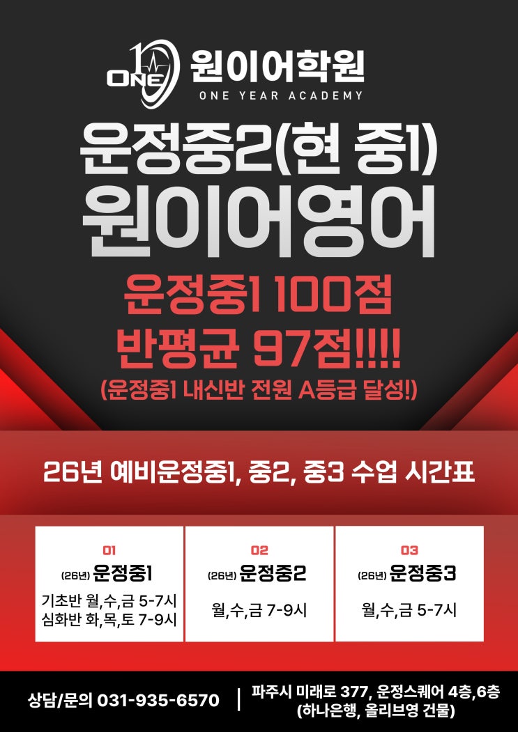상담 및 등록 문의 전화: 031-935-6570 주소: 경기도 파주시 미래로 377, 운정스퀘어(올리브영 건물) 4층, 6층 학원등록번호:2084호 중1영어/수학:260.000원 중2 영어/수학:280.000원 중3 영어/수학:300.000원 고1 영어/수학:340.000원 고2 영어/수학:360.000원 고3 영어/수학:380.000원 수학 2과목 등록시:+40.000원 #원이어학원, #원이어영어학원, #원이어영어학원 #운정중영 #운정중기출분석 #운정중학원 #운정중수학학원, #운정중영어학원, #운정영어학원, #운정영수학원, #파주운정중학교 <img src="https://blogthumb.pstatic.net/MjAyNTEyMTNfNzYg/MDAxNzY1NjA5NzIzMjgw.8-HHxUUp-fL-i51RWsuudlsei9pWW_Xeyc5Bl2OtJ10g.xSQe1SWNWdv2afwGvzXSfrxGUkxannkJ62inZmYOxawg.JPEG/%BF%EE%C1%A4%C1%DF%C7%D0%B1%B3-001.jpg?type=s3" />