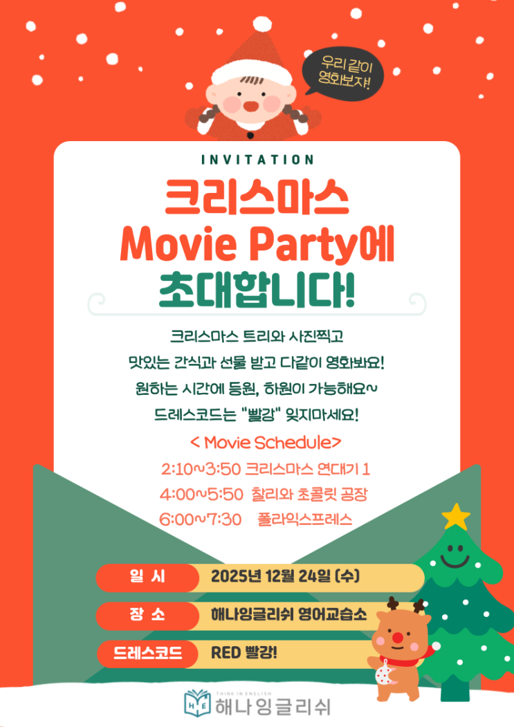 [크리스마스 Movie Party 안내] 안녕하세요 해나잉글리쉬입니다. 2025년 크리스마스 이브! 우리 친구들과 함께 즐길 Movie Party를 준비했습니다! 드레스코드는 레드(Red) — 잊지 말고 꼭 준비해주세요! 크리스마스 트리 앞에서 사진도 찍고, 간식과 선물도 받고, 재미있는 영화까지 함께 즐길 예정입니다. 영화를 처음부터 관람하고 싶다면 영화 상영 시간에 맞춰 등원하는 것을 권장드립니다. 하지만 다른 일정이 있는 경우에는 가능한 시간에 자유롭게 등·하원하셔도 됩니다. 평소 등원 요일이 아니어도 방문해주세요! 재원생 모두에게 드릴 작은 크리스마스 선물도 준비되어 있답니다 우리 아이들에게 즐겁고 오래 기억....... <img src="https://blogthumb.pstatic.net/MjAyNTEyMTBfMTkz/MDAxNzY1MzM0Mzc1NDg2.JUTyojDVWAaghhUSZrCsDoKhF0DDGfQQrBj7dN907lIg.Ecs_zMJDhLwjt3g9pguYZ35G6wcNL1QHsR5waHM5mjIg.PNG/%C6%C4%C6%BC%C0%CC%BA%A5%C6%AE%A3%AD001%A3%AD1.png?type=s3" />