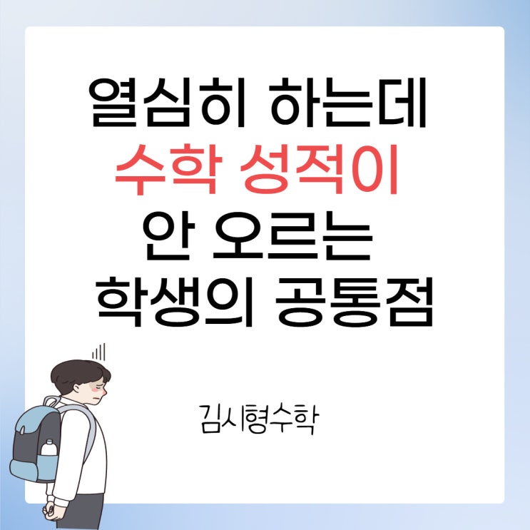 안녕하세요? 강동구 수학학원 소수정예 원장 직강으로 꼼꼼하게 지도하는 김시형수학입니다. 상담 중에 학부모님들께 상담 중 가장 자주 듣는 말이 있습니다. “문제집은 정말 많이 풀어요.” “개념서도 했고, 유형서도 했고, 심화도 시켰는데 점수가 안 올라요.” 사실 이 말속에는 지금 많은 학생들이 겪고 있는 수학 공부의 핵심 문제가 그대로 담겨 있습니다. 문제는 노력 부족이 아닙니다. 공부 방법의 구조에 있습니다. 수학 성적이 오르지 않는 진짜 이유 ‘난이도 사이의 간격’을 그대로 뛰어넘기 때문입니다 대부분 학생들의 수학 공부 흐름은 비슷합니다. 개념서, 유형 문제집, 심화 문제집 겉으로 보면 아주 정상적인 순서입니다. 하....... <img src="https://blogthumb.pstatic.net/MjAyNTEyMTNfMTk4/MDAxNzY1NjIyMjM4MTU5.1xTFB8pTmQ0-hwstpflK8wwHVgYp9WgIX90dGCRcLSEg.oVD1p53wTbuhswdeW1Yq1tHQOdNk8o25dHticbjJ_c8g.JPEG/%C1%A6%B8%F1%C0%BB_%C0%D4%B7%C2%C7%CF%BC%BC%BF%E4_%2838%29.jpg?type=s3" />