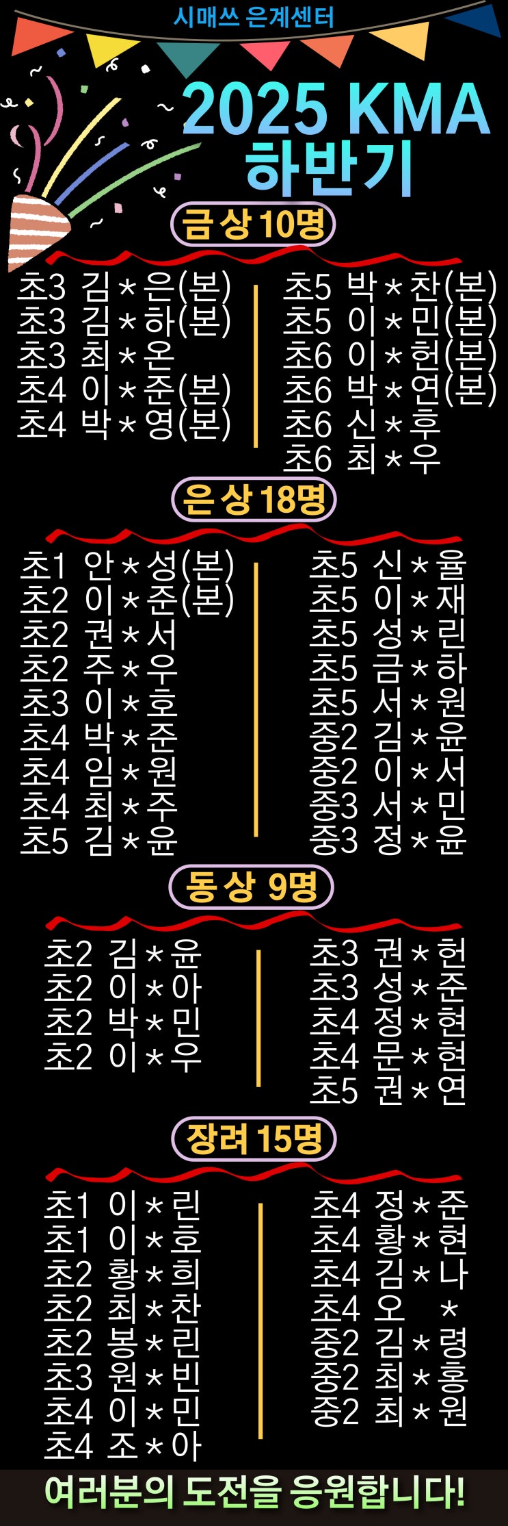 안녕하세요!! 사고력 수학과 교과 수학을 한번에 과정을 중시하고 결과로 보여드리는 언제나 ~ 역시 시매쓰 은계센터 입니다. 초등부터 중등까지, 중등에서 고등까지, 탄탄한 서술형 수학을 기반으로 하는 전문적 커리큘럼과 철저한 관리력을 최우선으로! '모든 재원생에게 최고의 수학학습을' 이라는 목표로 저희 원의 모든 선생님들께서 전력을 다해 지도/관리하고 있습니다. 한결같은 가르침으로! 시매쓰 은계센터만의 특별함으로! 수학교육을 뚝심있게 유지하고 지켜온 값진 결과에 더~ 힘을 내어 지도합니다. 늘 감사합니다. - 테스트/상담문의 - 031-507-0254 (예약필수) <img src="https://blogthumb.pstatic.net/MjAyNTEyMTJfMzQg/MDAxNzY1NTMwNzY2NDUw.gVXZjUwVunmTAMAlY4KjFT1henzKzj0-QWsSgdppZm0g.Wssxwtl4BSaeFtFDyuiLi_b424KDQAjmegNmFFthPD4g.JPEG/25%B3%E2_%C7%CF%B9%DD%B1%E2_kma.jpg?type=s3" />