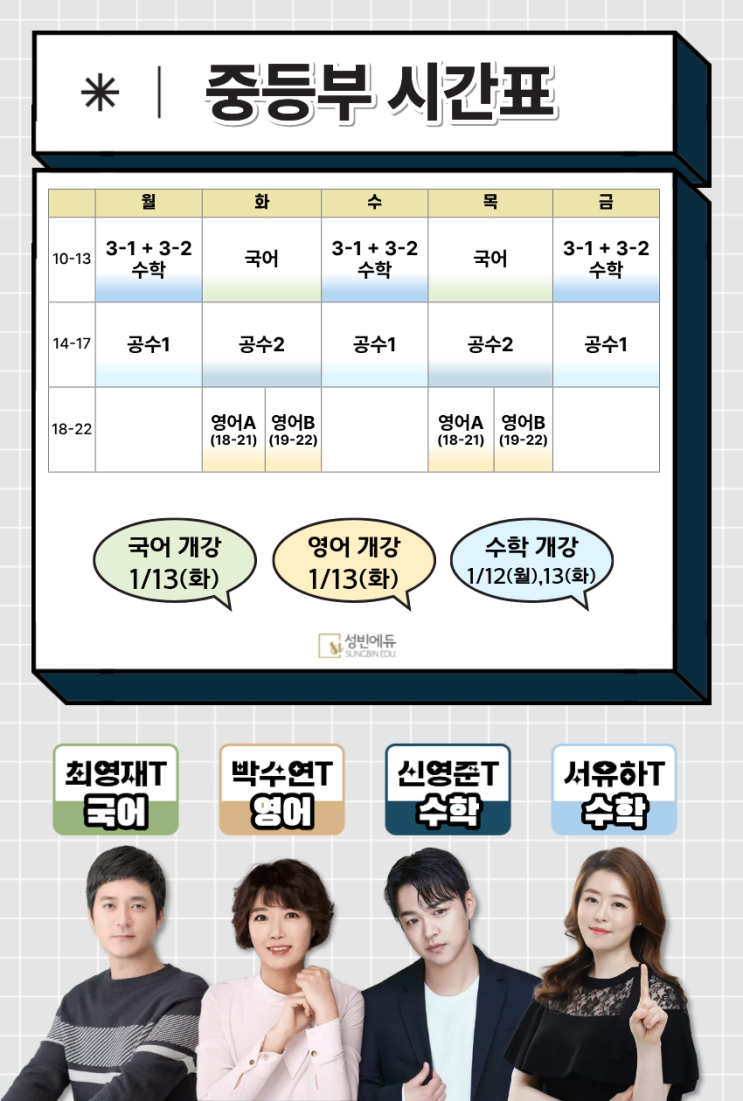 안녕하세요, 성빈학원입니다 드디어 많은 분들이 기다리셨던 중등부 정규 개강 안내를 드립니다! 이번 겨울, 중등 학습은 단순히 ‘예습 몇 단원’으로 끝나는 시기가 아니라 고등 과정의 기초를 다지는 결정적 시기입니다. 중학교 때 탄탄하게 잡아두어야 고등에서 실력 격차가 확 벌어지지 않는 것, 이미 수많은 데이터를 통해 확인된 사실이에요 ✨ “지금은 아직 중학생인데… 나중에 해도 되겠지?” 사실 가장 위험한 오해이기도 합니다. 중등 시기에는 학습 습관, 개념 이해도, 문제 접근 방식, 과목별 기초 등 여러 습관이 자리 잡습니다. 이 시기를 놓치면 고등에 올라가서 두 배로 힘들어지는 구조이기 때문에, 이번 겨울....... <img src="https://blogthumb.pstatic.net/MjAyNTEyMTFfMyAg/MDAxNzY1NDU1MDc4OTk5.1nafv0oADEp_AQXkMDU5T8w8w7fyvqLUx06T7dUu3XQg.fZXqhviWoq_7HIM0vE5FRmCO-n4QtM2sNcbbfeo5FHUg.PNG/%C1%DF%B5%EE%BA%CE_%C0%A9%C5%CD_%BD%C3%B0%A3%C7%A5_%284%29.png?type=s3" />
