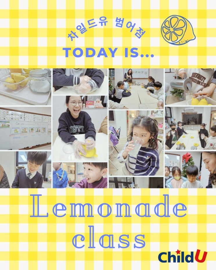 안녕하세요, 차일드유 범어점 엠제이 원장입니다 지난주에는 미국교과서 GK003 스토리 ‘Let’s Make Lemonade!’ 내용을 가지고 아이들과 함께 작은 레몬에이드 만들기 체험을 해보았습니다. GK003 단계는 아이들이 짧은 스토리를 읽으며 패턴 문장을 자연스럽게 익혀가는 기본 단계예요. 이런 활동이 함께 들어가면 표현이 훨씬 쉽게 연결됩니다. 수업은 스토리에 나오는 표현을 가볍게 소리 내어 읽어보는 것부터 시작했어요. Can you squeeze the lemon? Yes, I can squeeze the lemon! 아이들이 그림과 문장을 함께 보니 금방 따라 말하며 집중하더라고요. 레몬을 실제로 squeeze 해보는 건 모두 처음이라 아이들이 굉장히 신기해했어....... <img src="https://blogthumb.pstatic.net/MjAyNTEyMTFfMTc2/MDAxNzY1NDIwNjQyMDY5.Y5LLKtyO0-deyVJgNmxo6XHWFs9pqPnbn7oeoxN3uyMg.kZ2SKcxW2_8mA5o86YRKNUZKb2iVbGHsXLpRAwMO0Ggg.JPEG/2.jpg?type=s3" />