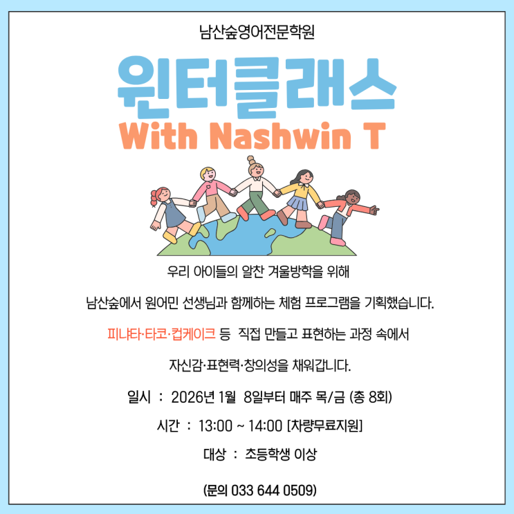 안녕하세요 남산숲영어전문학원입니다. 겨울방학, 아이에게 어떤 경험을 선물하고 싶으신가요? ❄️ 2026년, 남산숲에서 최초로 원어민 특강이 열립니다! 놀이처럼 즐겁고, 수업처럼 알차고, 배움이 자연스럽게 스며드는 원어민 쿠킹 & 문화 체험 클래스! 4주 동안 아이들이 직접 만들고 표현해요 1월 8일부터 매주 목요일, 금요일 원어민 선생님과 함께 피냐타, 타코, 컵케이크 만들기 영어로 공부하고 표현하고 만들기까지 함께합니다! 손으로 만들고, 입으로 표현하고, 눈으로 배우는 겨울방학 재미·영어·문화·자신감까지 한 번에 경험할 수 있는 특별한 시간이랍니다. 단순히 놀기만 하는 체험형 수업이 아니라 타문화....... <img src="https://blogthumb.pstatic.net/MjAyNTEyMDlfMjE1/MDAxNzY1MjY3MTcwODc1.nk7n7p1diZUvzDGzKH3NI0kJCtmk2U0KyjewEBM3gMwg.QWXGpr-mtUsqnNqvqOibcJrVf2_fWsYf9x3T-QYaarAg.PNG/%C1%A6%B8%F1%C0%BB_%C0%D4%B7%C2%C7%D8%C1%D6%BC%BC%BF%E4_%287%29.png?type=s3" />