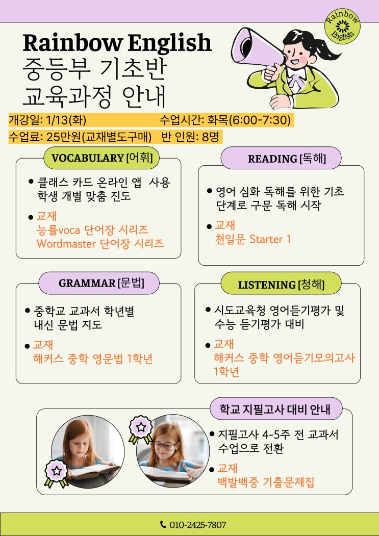 레인보우 영어학원 2026년 예비중1 수업과정 안내 모집중