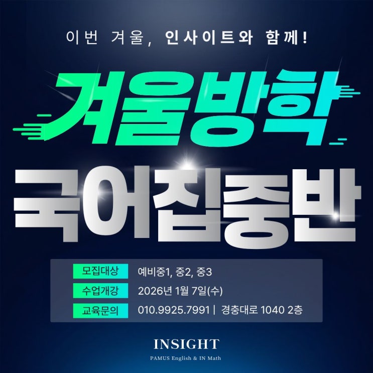 안녕하세요, 인사이트학원입니다. 다가오는 1월, 중등 국어 집중반을 모집합니다! ⭐인사이트 국어 집중반⭐은 이렇게 준비합니다! 즉, 내신 + 수능 두 축을 동시에 잡는 커리큘럼으로 운영됩니다. ✨국어·과학 교육비 이벤트✨ 겨울방학 국어·과학 한정 1월 특별 할인 이벤트 안내드립니다! 1️⃣국어 + 과학 두 과목 등록 시 30% 할인 2️⃣국어 또는 과학 한 과목 등록 시 20% 할인 중등 국어, 과학을 고려하신 학부모님께는 가장 혜택이 큰 시기입니다! 올겨울, 인사이트학원이 국어는 문해력·독해력, 과학은 개념 이해·탐구력으로 확실하게 성장시켜드리겠습니다! 시간표 및 교육비 문의는 네이버 톡톡 또는 아래 번호로 연락주시....... <img src="https://blogthumb.pstatic.net/MjAyNTEyMTJfMTAy/MDAxNzY1NTEzMjQ5OTA2.3dpJhnsmMbNpJtO6O0YetaQg5lSHrOxUDMkgiM5riBsg.UpWmOHldXNcjiQyus0o6qK4I5WUSCSZfm0tEWEC5b2Ig.JPEG/1.jpg?type=s3" />