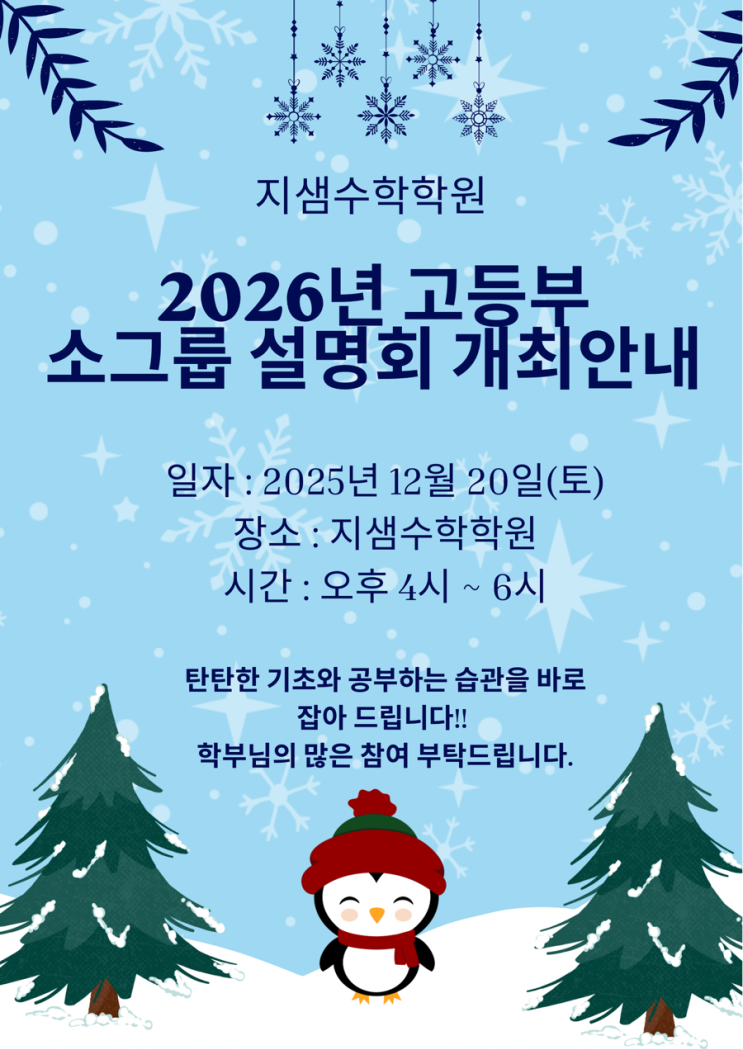 오늘은 지샘수학학원에서 2026년 고등부 소그룹 설명회 모집에 대해 안내드리겠습니다!! 2026년 고등부 소그룹 수업 설명회 • 일자 : 2025년 12월 20일(토) • 시간 : 오후4시 ~ 6시 • 장소 : 지샘수학학원 소소하고, 알차고, 꼼꼼한 고등부 소그룹 설명회 많은 참여 부탁드립니다!! 상담문의 ☎️ 010-4079-2227 ☎️ #지샘수학학원 #고등수학 #율하1지구수학학원 #지혜가샘솟는지샘수학학원 #율하중학교 #율하중학교1학년 #율하중학교2학년 #율하중학교2학년 #율하중학교내신 #율하중학교수학내신 #율하중학교중1수학 #율하중학교중2수학 #율하중학교중3수학 #율하중학교수학선행 #율하중학교1학기중간고사 #율하중학교1학기....... <img src="https://blogthumb.pstatic.net/MjAyNTEyMTJfNjUg/MDAxNzY1NTI2MDkwMDE1.M6Hdu68jHeVBKMTPliDgEpQxt5g-Fu02sPQVKEXCtpAg.T20fvtURdy-qwvTsgEFlBNbqYv7jkjyzlmmULd16FA8g.PNG/Blue_and_Green_Modern_Winter_Sale_Poster_-_1.png?type=s3" />