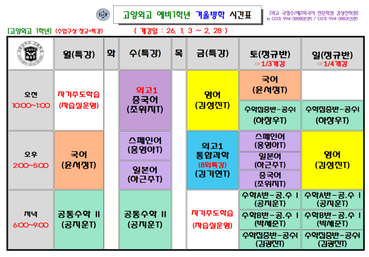 ★2026 고양외고 예비1/2/3학년 겨울방학 시간표★