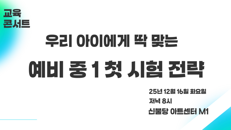안녕하세요. 수앤탐브릿지, (주)플랜아이교육입니다. 새 학년을 앞두고 많은 학부모님들이 이렇게 묻습니다. “우리 아이, 중학교 가서 잘 해낼 수 있을까요?” “집중력이 너무 약한데… 첫 시험은 괜찮을까요?” “공부를 안하는 걸까요? 아니면 못하는 걸까요?” 대한민국 최초 학습처방 전문 학원인 수앤탐브릿지는 이 질문에 가장 정확하게 답할 수 있는 곳입니다. 그래서 예비중1 학부모님들을 위해 특별한 무료 교육 콘서트를 준비했습니다. 예비중1 ‘첫 시험 전략’ 무료 교육콘서트 안내 - 날짜: 12월 16일(화) - 시간: 저녁 8시 - 장소: 신불당 아트센터 M1 - 주최: 수앤탐브릿지 · (주)플랜아이교육 - 참가비: 무료 (사전 예약 필수....... <img src="https://blogthumb.pstatic.net/MjAyNTEyMTFfNTAg/MDAxNzY1NDU0NDQyNDMw.N6zjs2G2yxk-qeATlgz5zt6bslvT3BDLuG001V8p9Rcg.Epz2jKrzX5FvtAMbpB1DGDGoLb4KlQcXgnkf_S4l-Msg.PNG/KakaoTalk_20251211_204244530_04.png?type=s3" />