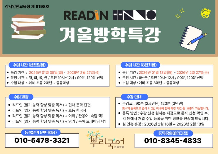 안녕하세요, 리드인 뿌리국어논술학원입니다. 저희 뿌리국어에서는 겨울방학을 맞이하여 이번에도 독서 집중 특강을 준비했습니다. 겨울방학은 새로운 학년을 맞이하기 전, 우리 아이의 학습 능력을 한 단계 끌어올릴 수 있는 골든 타임입니다. 저희 학원은 이 소중한 시간을 활용하여 '깊이 있는 독서를 통한 필수 기본 소양 배양'에 전념하고자 합니다. 왜 지금, 리드인의 독서 특강이어야 할까요? 변화하는 교육 과정에서 '정보 이해력'과 '문제 해결력'의 핵심은 결국 읽는 능력입니다. 단순히 글자를 읽는 것을 넘어, 내용을 비판적으로 분석하고 자신의 지식으로 통합하는 역량이 모든 교과의 성패를 좌....... <img src="https://blogthumb.pstatic.net/MjAyNTExMTlfMjgg/MDAxNzYzNTMyMTg3Njg4.BMu0A3-H3ArPHIHeGJt1prOrVbBRlevDtO9rgHhYrtEg.LBZNhGX3Vm00TAL4a0fzEtJE7UOT5avUC4QnZmHOX34g.JPEG/%B9%E6%C7%D0%C6%AF%B0%AD.jpg?type=s3" />
