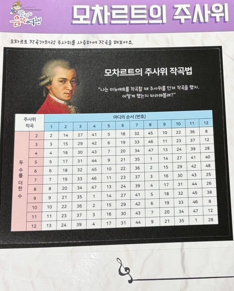 정평동 피아노학원 어드벤트캘린더활동 정평동 피아노학원과 함께하는 주사위 작곡법 어드밴트 캘린더 이야기 12월~~~~크리스마스 시즌이 다가오면, 설렘과 함께 어드벤트 캘린더가 많은 이들의 마음을 따뜻하게 합니다. 어린음악대 정평원 음악학원에서는 이 전통적인 어드벤트 캘린더에 음악적 재미를 더한 특별한 프로젝트를 진행하고 있어요. 우와!!! 바로 ‘주사위 작곡법’을 활용한 12마디 작은 세도막 형식의 작곡 활동입니다. 주사위 작곡법이란? 모차르트도 즐겨 썼다는 ‘주사위 작곡법’은 주사위를 던져 나온 숫자를 기준으로 미리 준비된 악보 조각들을 선택해 연결하는 독특한 작곡 방식이에요. 어린음악대 정평원 음....... <img src="https://blogthumb.pstatic.net/MjAyNTEyMTFfNjgg/MDAxNzY1NDI5NzQ4NTA0.9c-lgLVtHJFnFi5nnTu45Zjk1KLy-cMOJGNHSbgq0fcg.yEwkeNXAqehA6aV0OkbDrfiiD0BJrjxvfwQXJx_TEX4g.JPEG/IMG%A3%DF6089.jpg?type=s3" />