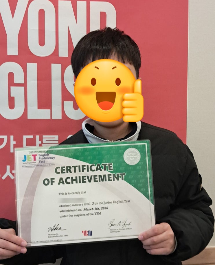안녕하세요. 결과가 다른 영어 비욘드잉글리쉬 기흥서천캠퍼스입니다. 우리 비욘드 친구들이 지난달 3월 7일에 한국토익위원회에서 주관하는 JET를 응시하였습니다. JET란? JET 시험은 한국 토익위원회가 초등학생들의 영어능력을 평가하기 위해 개발한 시험으로 학생들의 영어 실력을 종합적으로 평가할 수 있는 영어인증시험입니다. 더 자세한 내용은 ↓↓↓↓↓ 부쩍 추워진 날씨로 몸이 움츠러드는 이 계절에도 우리 아이들의 영어 학습에 대한 열기는 대단합니다. 매일의 꾸준한 듣고, 말하고, 읽고, 쓰기 연습을 이어온 우리 아이들이 기쁜 소식을 전합니다. JET(Junior English Test) 전원 합격의 놀라운 결과! 모두 모두 축하합니다!!!! ....... <img src="https://blogthumb.pstatic.net/MjAyNjA0MTNfNjYg/MDAxNzc2MDY2NjI2NzA5.Pg_o-j0F8Ev3frv9wRVb-868UaEARTGAQBnU5lABKFcg._azLHew5mrmKNDnQWvYLz9sGSO5pu1RFMIRPxY37rAYg.JPEG/KakaoTalk_20260326_130042435.jpg?type=s3" />