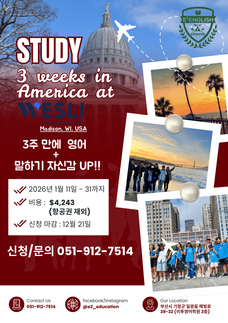 미국 매디슨에서 특별한 3주 영어 몰입 프로그램! 배우고, 경험하고, 영어 실력과 잊지 못할 추억을 함께 가져오세요. Give yourself a life-changing 3-week English immersion experience in Madison, USA! Learn, explore, and return with stronger English and unforgettable memories. #교육 #일상 #데일리 #부산 #여행 #영어연수 #미국영어연수 #어학연수 #단기어학연수 #영어캠프 #영어학습 #영어자신감 #영어잘하고싶다 #영어공부그램 #영어교육#미국여행 #미국3주연수 #해외경험 #해외교육 #청소년연수 #청소년프로그램 #부산영어학원 #기장영어학원 #일광영어학원 #아이들교육 #부산맘 #기장맘 #학부모그램 #부산그램 #부산교육 #부산....... <img src="https://blogthumb.pstatic.net/MjAyNTEyMTBfMTIw/MDAxNzY1MzUxNzMzMTY2.4WsUOVRg7u0DYYP5lmRv-9CAveaO-6x08MgCDtv0uD4g.6Gw_FT9eh4oM8XM0zppw8ArTPCTT-6hiHEE5HsN_mCsg.PNG/Student_Abroad_%281%29.png?type=s3" />