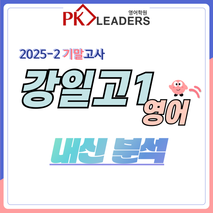 강일고1 영어 내신-출제 구성 [시험범위] ■ 교과서 : 공통영어2 YBM(김) 3과 ■ 모의고사 : 2024년 고1 10월 모의고사 ■ 능률보카 고교기본편 : Day 31~40 ■ 듣기: 2024년 고1 10월 모의고사 듣기+교과서 2과 대화문 [영역별 출제구성] ■ 객관식 30문항 (100점) ① 교과서(듣기포함) : 6문항 (20.3점) ② 모의고사(듣기포함) : 20문항 (66.9점) ③ 능률보카: 4문항 (12.8점) ■ 서논술형 0문항 (0점) [유형별 출제구성] 어휘 4 빈칸 7 어법 1 세부내용 7 중심내용 11 강일고1 영어 내신-난이도 및 총평 ■ 난이도 : 최상 / 상 / 상중 / 중 / 하 [총평] 이번 2학기 기말고사는 수능형 독해 요소가 강화된 구성을 보이며, 전반적으로 안정적....... <img src="https://blogthumb.pstatic.net/MjAyNTEyMTFfMjA0/MDAxNzY1NDQ4MDk1OTY2.83Xtiw0AMEDrCKtu5XGZ02FGlMxzl3_M-dl-XjU6r9Ag.cK0Yg4FIGEPXrwcXNjONqLNGoxubOdGBPKSqM4tjww8g.PNG/001.png?type=s3" />