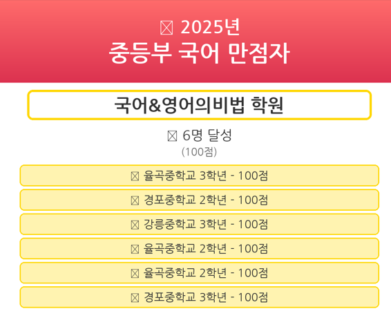 2025년 국어&영어 성적 우수자 | 강릉 교동·유천 국어&영어의비법 학원(2학기 기말 제외)