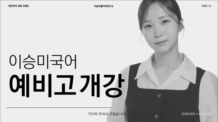 안녕하세요, 이승미통국어연구소입니다. 이승미 국어, 다시 달립니다!! 오늘은 이승미 선생님 현장 설명회 일정과 예비고1, 예비고2 겨울특강에 관련된 내용을 안내해 드리고자 합니다~ 수많은 학생들의 요청과 기다림 속에, 오랜 기간 사랑받아온 이승미 선생님께서 돌아오셨습니다!! 이미 실력으로 검증된 강의력, 후기로 증명된 높은 만족도, 학생들의 성장을 최우선으로 하는 분명한 지도 철학! 이 모든 장점 그대로, 더욱 강화된 학습체계로 돌아왔습니다 국어 학습의 대명사 '믿듣승미' "Now, it begins." 1. 이승미 선생님 현장 설명회 (대상: 예비고1) 일정: 12월 2일 (화) 저녁8시 2. 예비고1 겨울특강 개....... <img src="https://blogthumb.pstatic.net/MjAyNTExMjNfMTY0/MDAxNzYzODk2MzcwNzIx.3diGaBuWz_KJCAp03CjL_4-wXu2PG6y51NzT4vCaVyMg.xJEE9Zah_ssX1AuufgTPOG5UWZfovO0jrt5Dd8wLnOcg.PNG/image.png?type=s3" />