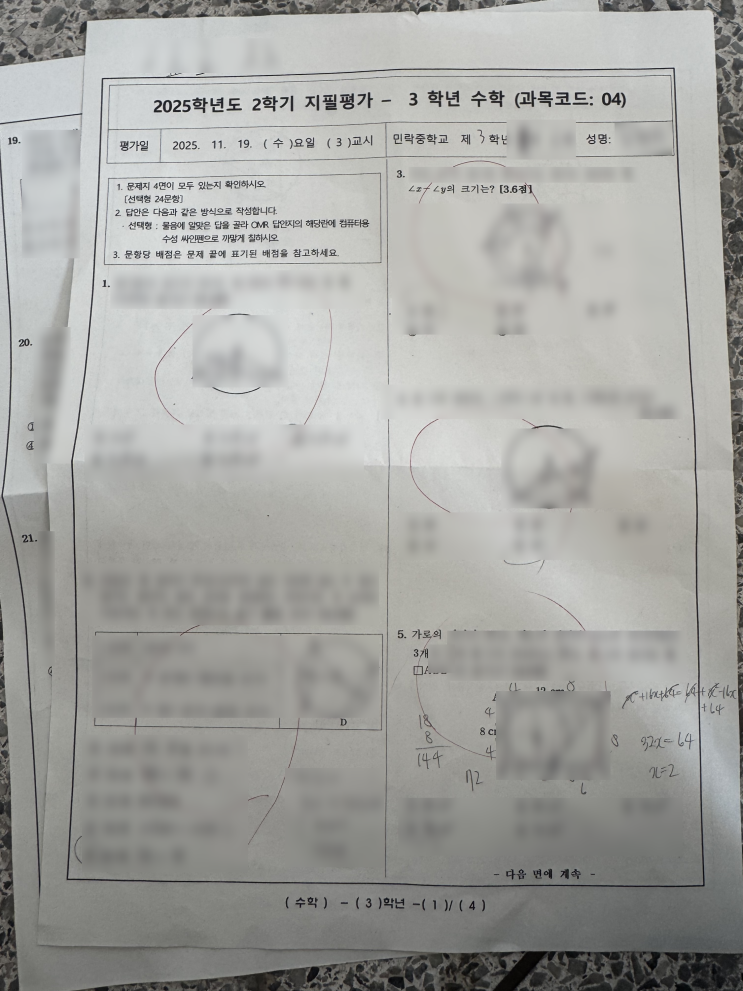 민락중 3학년 학생이 10월에 새로 등록해서 시험까지 약 한 달간 수업을 진행하였습니다. 그 결과, 1학기 63점 → 2학기 86점 무려 20점 이상 상승하였습니다!! 중학교 수학시험에서 처음으로 80점을 넘었다고 하네요 ㅎㅎ.. 수업을 하면서 제일 많이 들었던 생각은 '도대체 그동안 점수가 왜 안나온걸까..?' 였습니다. 이전 학원에서 정리가 잘 되어있지 않은 것들도 알려주면 빠르게 이해하고 문제도 잘 풀어내었습니다 한 달만 더 일찍 왔으면 100점 까지도 나올 수 있지 않았을까 싶었습니다. 참..고마운 학생입니다 ㅋㅋ (크게 힘들이지 않아도 알아서 잘 풀고 점수가 오르니까요 ㅎㅎ..) 솔직하게 모든 학생들에게 일어나는 일은....... <img src="https://blogthumb.pstatic.net/MjAyNTEyMDJfNDcg/MDAxNzY0NjIwNzQ4OTk0.S88R-XU3roli_Pil152IhwH3gSivOezat9edmAXVx2Ig.CagKGLEh6PAZH_en1Krh2fL3MCW1G7Wj0G9pIx0R7jUg.PNG/image.png?type=s3" />