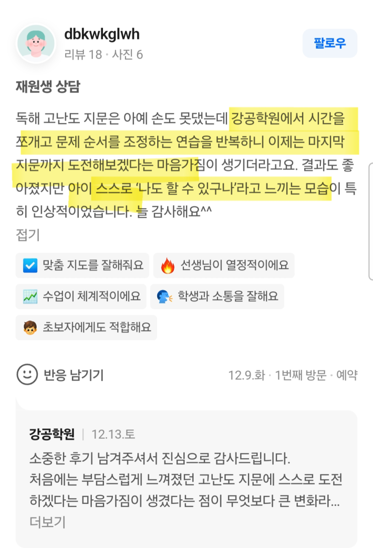 수업 안에서 아이가 어떻게 달라졌는지, 상담 이후 부모님의 마음이 어떻게 변했는지 담은 후기들을 정리했습니다. 화정행신 고등영어전문 강공학원에서 상담을 하다 보면 학부모님들께서 가장 많이 물어보시는 것은 다른 아이들은 어떤 변화를 겪었는지입니다. 이 글에는 강공학원 수업을 경험하며 화정 행신동 고등학생들의 태도와 실력이 어떻게 달라졌는지를 담은 후기들을 한자리에 모았습니다. 아이의 성장은 단기간의 결과가 아니라, 매 수업을 어떻게 쌓아 가느냐의 문제라고 생각합니다. 앞으로도 강공학원은 한 명 한 명의 가능성을 가볍게 보지 않고, 맡겨주신 마음에 책임으로 답하는 수업을 이어가겠습니다. ★문의는 톡톡 메뉴를 이....... <img src="https://blogthumb.pstatic.net/MjAyNTEyMTNfNjgg/MDAxNzY1NjEyNzYwMTQ0.Z0W-b3GOMG7Q9iCWr-yS-CxRSahJjJHSBxUVxvD-P9Mg.sJD_fA6c7Dh1L5ZtHAGrBIjQKXLMIkFgTUmdRsTKXpUg.PNG/%C8%AD%C1%A4%C7%E0%BD%C5%B0%ED%B5%EE%BF%B5%BE%EE%C7%D0%BF%F8_%281%29.png?type=s3" />