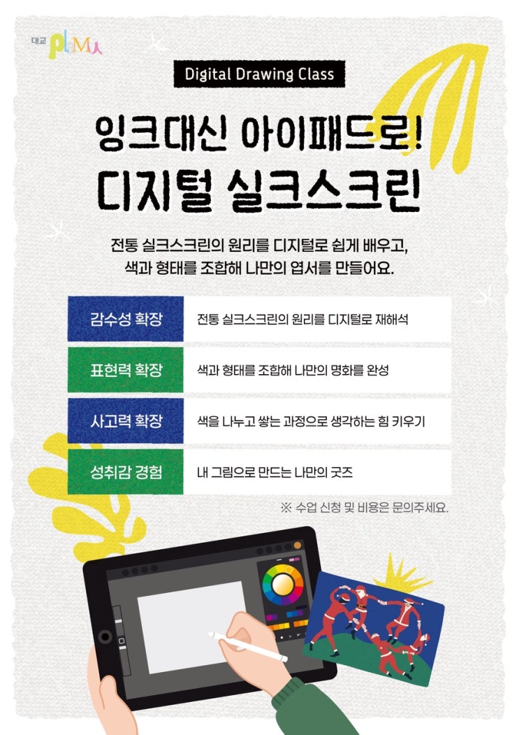 잉크 대신 아이패드로 만드는 디지털 실크스크린 송도아동미술 송도플래뮤에서 플래뮤만의 차별화된 아이패드 미술 수업을 소개합니다. 방학특강과 1월 정규수업 중 선택하여 수강하실 수 있어요! <방학특강 – 총 4회> 기간 1월 7일(수), 1월 14일(수), 1월 21일(수), 1월 28일(수) ⏰ 시간 10:00 ~ 11:30 (90분) 수업 내용 매 회차 엽서 사이즈 작품 1점 완성 <1월 정규수업 – 4회> 기간 1월 6일(화) ~ ⏰ 시간 화 / 목 중 택 1 1:00 ~ 2:30 (다른 타임 문의 가능) 수업 내용 매 회차 엽서 사이즈 작품 1점 완성 ⭐️수업 준비물 아이패드, 아이패드펜슬, 프로크리에이트(19,000원) 미리 설치....... <img src="https://blogthumb.pstatic.net/MjAyNTEyMTJfMTI5/MDAxNzY1NTM2NDIzNjc1.lgC42KyliuOAQnlp1ifaGcX_3dfU2BvqRAoiuRh1UrEg.ymdTdlwp3pjiW_kyn1fLMp3RgACwmqpx5CHrNU0OOCQg.JPEG/IMG%A3%DF3803.JPG?type=s3" />