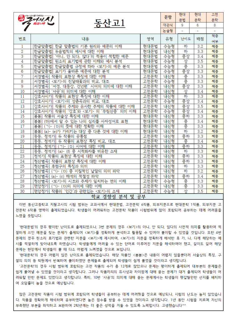 안녕하세요. 국어의신학원입니다. 동산고1 2학기 2차 지필고사 분석입니다. 다른 학교에 비해 빠르게 시험을 봤는데요. 어떻게 나왔는지 확인하겠습니다. 이번 동산고등학교 지필고사의 시험 범위는 교과서에서 현대문법, 고전문학 6작품, 외부지문으로 현대문학 1작품, 외부지문 고전문학 6작품 영역이 출제되었습니다. 학생들이 어려워하는 고전문학 작품이 시험범위에 많이 포함되어 공부하는 데에 어려움을 느꼈을 듯합니다. ‘현대문법’의 경우 평이한 난이도로 출제되었으나, 3번 문제의 경우 <보기>의 아니, 안 되다, 않다의 사전적 의미를 활용하여 적절하게 쓰인 예문을 찾는 문제가 출제되어 <보기>를 정확하게 분석하고....... <img src="https://blogthumb.pstatic.net/MjAyNTExMjlfOTcg/MDAxNzY0MzgzNjEzNjc5._ugGZly3R5vovZivr0_C0K79sZ3QTSv4KbV5MDmjVwwg.PkLlnNQZOnsv6l0QMcUtjl_b8sj1mwNkAiOyb-1PM98g.PNG/%B5%BF%BB%EA%B0%ED1_2025%B3%E2_2%C7%D0%B1%E2_2%C2%F7_%C1%F6%C7%CA%B0%ED%BB%E7_%BA%D0%BC%AE001.png?type=s3" />