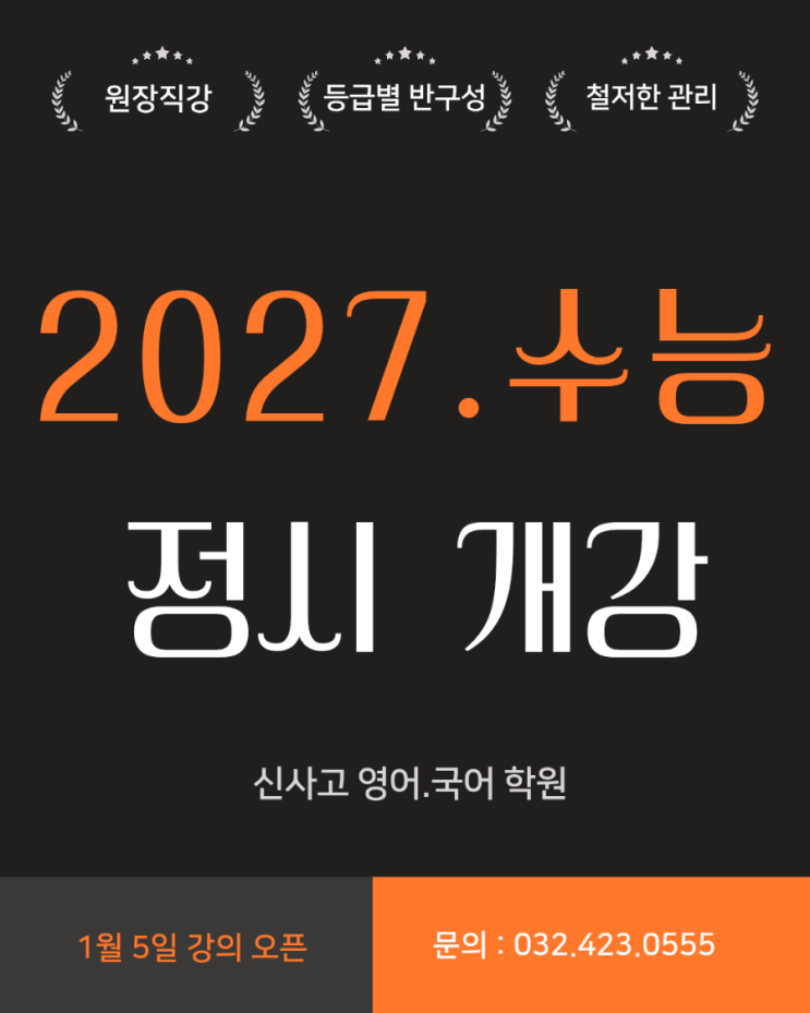 안녕하세요. 2027.수학능력시험 정시반 개강합니다. 매년 하는 신사고 정시는 등급별로 소수 인원으로 반을 구성 등급에 맞는 수업으로 진행합니다. <img src="https://blogthumb.pstatic.net/MjAyNTEyMTRfOTYg/MDAxNzY1NzIwNTQ0ODkw.pLrch_6OAVJGSsQwt5g8RIMQkMdoc66BmTv3WHpeKpYg.PrBuXRp3D43S0HV2O1NDroj-C3txOrpH8MI7RY0qfcEg.PNG/900%A3%DF%C1%D6%C8%B2%BB%F6_%B0%FA_%C8%F2%BB%F6_%B0%CB%C1%A4_%B8%F0%B4%F8%C7%D1_%BA%EA%B7%A3%B5%E5_%B5%F0%C0%DA%C0%CC%B3%CA_%B0%AD%C0%C7_%C8%AB%BA%B8_%C0%CE%BD%BA%C5%B8%B1%D7%B7%A5_%B0%D4%BD%C3%B9%B0%A3%A84%A3%DF5%A3%A9%A3%DF20251214%A3%DF223353%A3%DF0000.png?type=s3" />