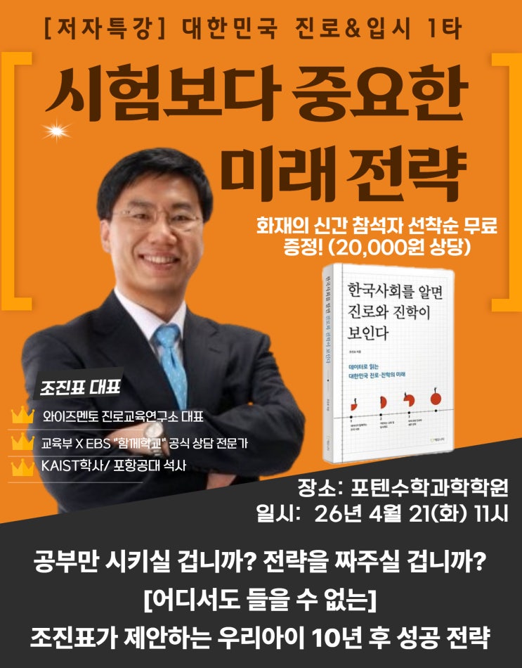 학부모님, 포텐 수학 양재열 원장입니다. 먼저 드릴 말씀이 있습니다. 학부모님들 덕분에 포텐 수학학원이 확장을 하게 되었습니다. 아이들을 믿고 맡겨주신 그 믿음이 쌓여서 여기까지 온 것 같습니다. 진심으로 감사드립니다. 확장 기념으로 뭘 해드릴까 고민하다가, 강연을 준비했습니다. 아이들의 "진로·진학에 대한 이야기", 직접 들으시고 도움이 되었으면 좋겠습니다. 상담하다 보면 이 말을 자주 듣습니다. "원장님, 고등학교는 어디로 보내야 하고 지금 뭘 준비시켜야 하는지 모르겠어요." 저도 다 안다고 말 못 합니다. AI가 어디까지 일자리를 바꿔놓을지, 10년 후에 어떤 전공이 살아남을지. 지금 이걸 확신 있....... <img src="https://blogthumb.pstatic.net/MjAyNjA0MTVfMTQ1/MDAxNzc2MTgwODkxOTE4.ykEFRj2RTV-iiM6-Tc8-LenTImaLTAeS98Ew_Fgu4yYg.Cw6uGhcxXpRiIKdJoSHWgLOw8OscpfvdyT0Kn-M36nkg.JPEG/KakaoTalk_20260414_141519798.jpg?type=s3" />