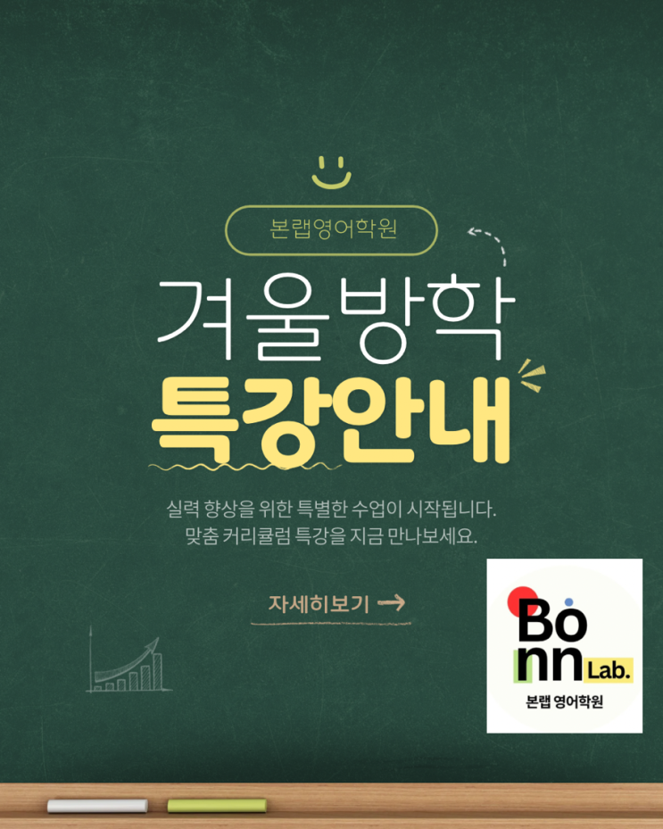 학부모님, 안녕하세요. 본랩영어학원 Bonn원장입니다. 우리 아이들이 중학교 교육과정을 마치고, 곧 고등학교로 진학하게 됩니다. 고입 원서 접수 과정도 마무리가 되었겠네요. 아이들 각자 희망하는 고등학교에 입학하길 바랍니다. 교육비 부담이 적지 않다는 것을 알고, 또한 우리 본랩 학생들이 고교 내신을 잘 해내길 바라는 마음에서 1,2월 진행하는 모의고사 특강을 무료로 진행하고자 합니다. ✅모의고사 무료 특강: 화 14-15:30 (총 6회차) ☑️정원 9명 ☑️ 12월 24일까지 접수. 선착순 마감. 재원생 우선 등록. (재원생에 한하여 무료, 비재원생은 15만원) 또다른 겨울방학(1-2월) 특강인, ✅단어특강은 예비고 학생들은 필수로 수....... <img src="https://blogthumb.pstatic.net/MjAyNTEyMTJfMjEw/MDAxNzY1NDY5NTEwMjE2.bjGCjiBQy4c0tTdsduMK4u4fs4akAwIMnekKnZEQpc8g.a5icvamhtRqh5T-BjvtWeUdFVD6GzSYzQAByaWreV_Yg.PNG/IMG%A3%DF1049.PNG?type=s3" />